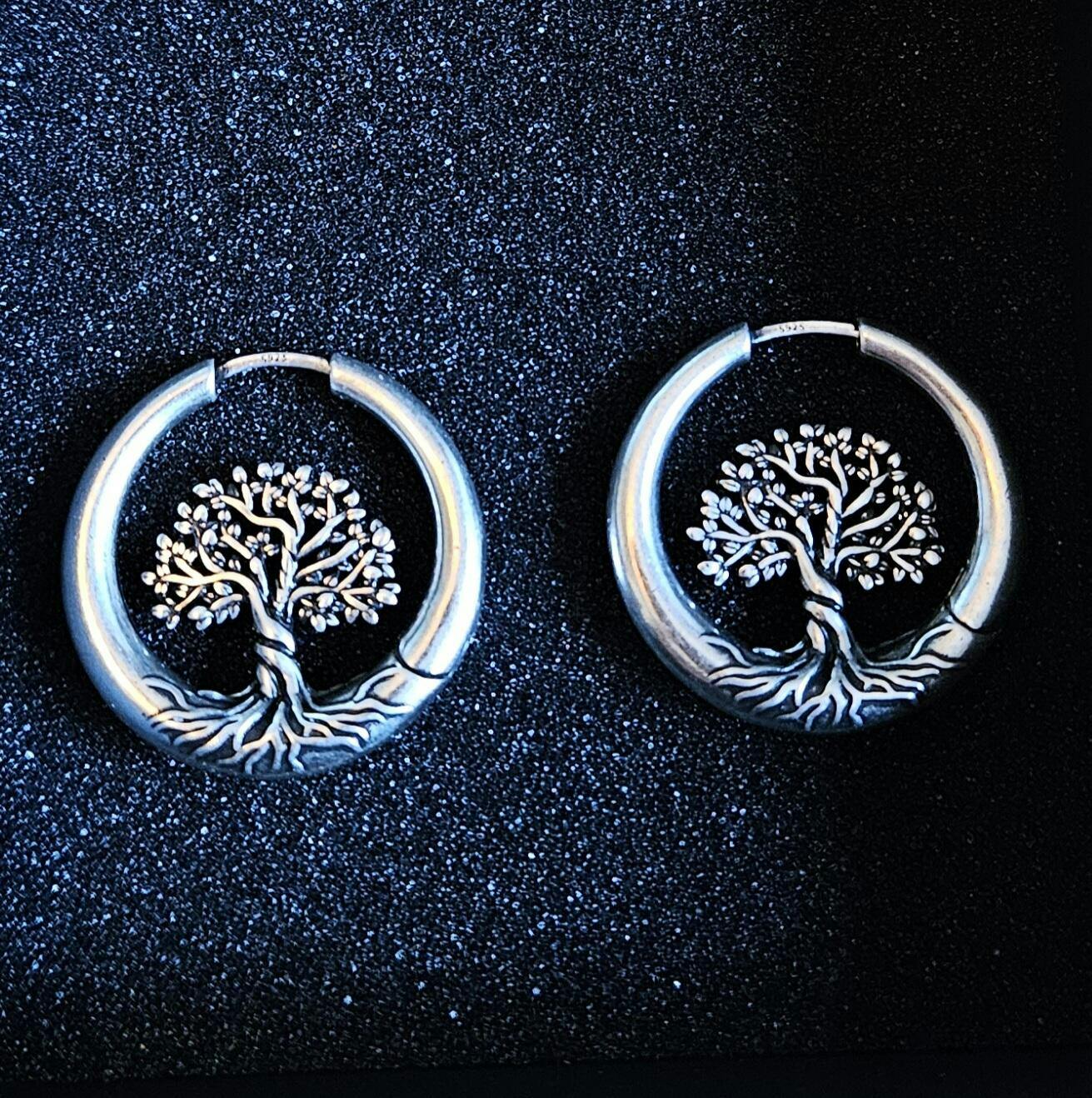 Smooth circular hoops frame a detailed Tree of Life with twisting branches and rooted lines for a symbolic nature-inspired silhouette. This item is sold as a pair.