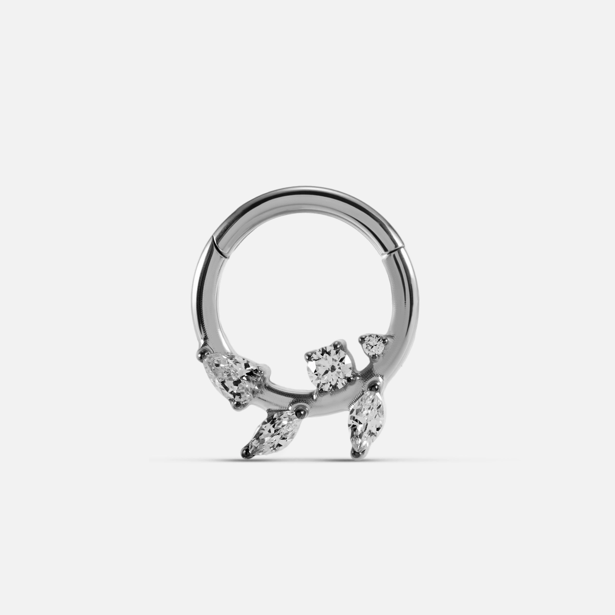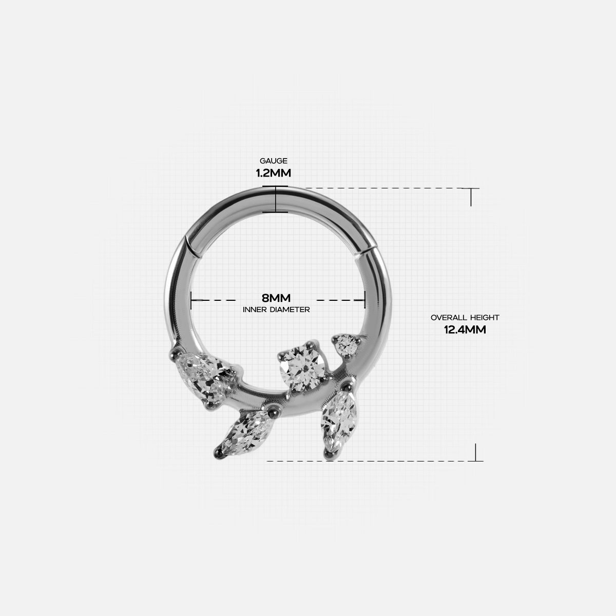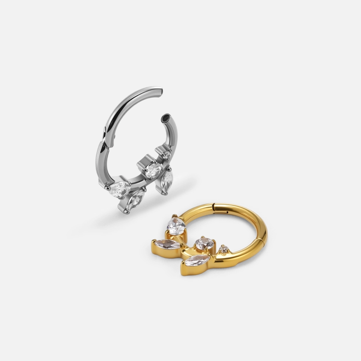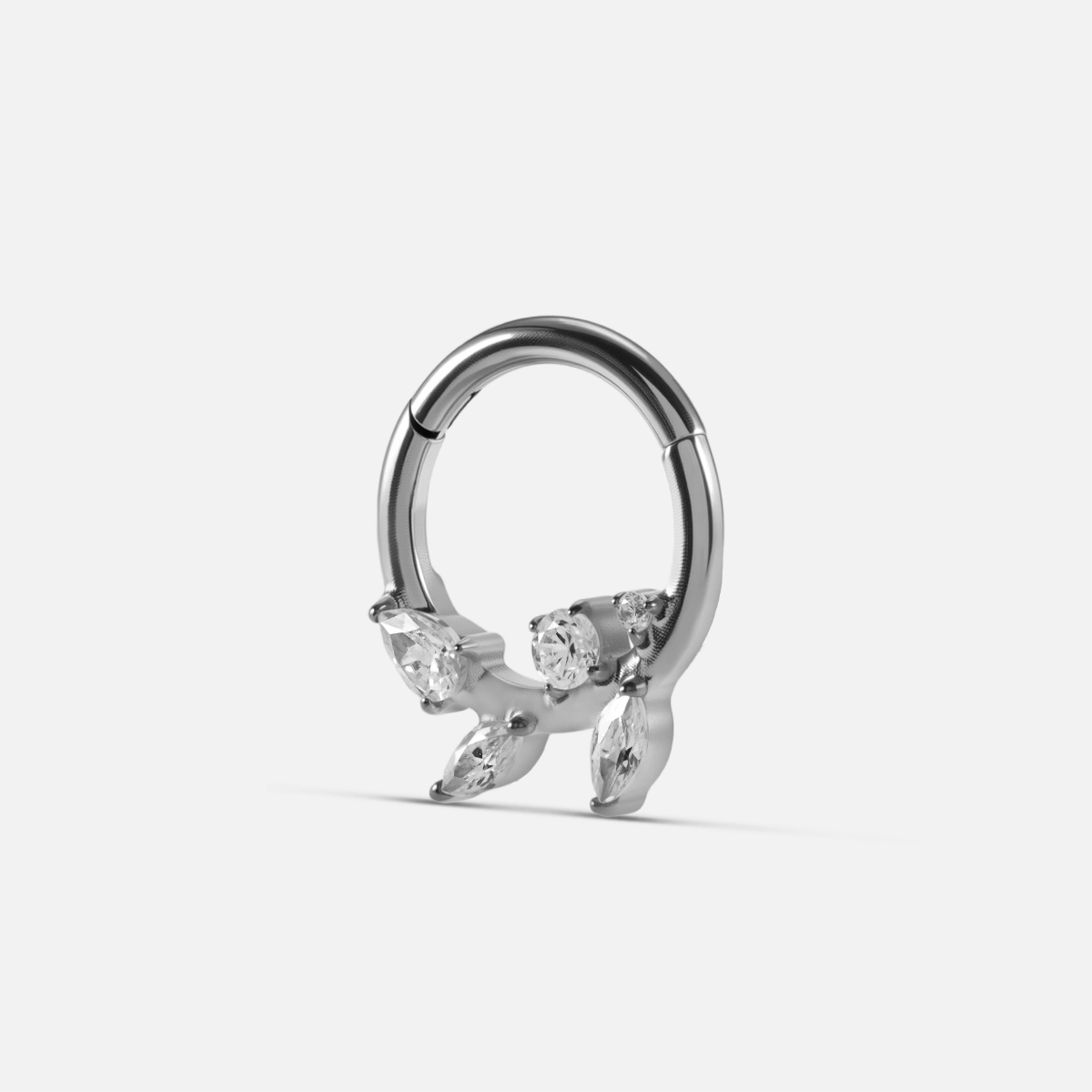 A curved clicker lined with tiny crystal leaves, creating a soft shimmering arc perfect for nose or septum piercings. This item is sold individually.