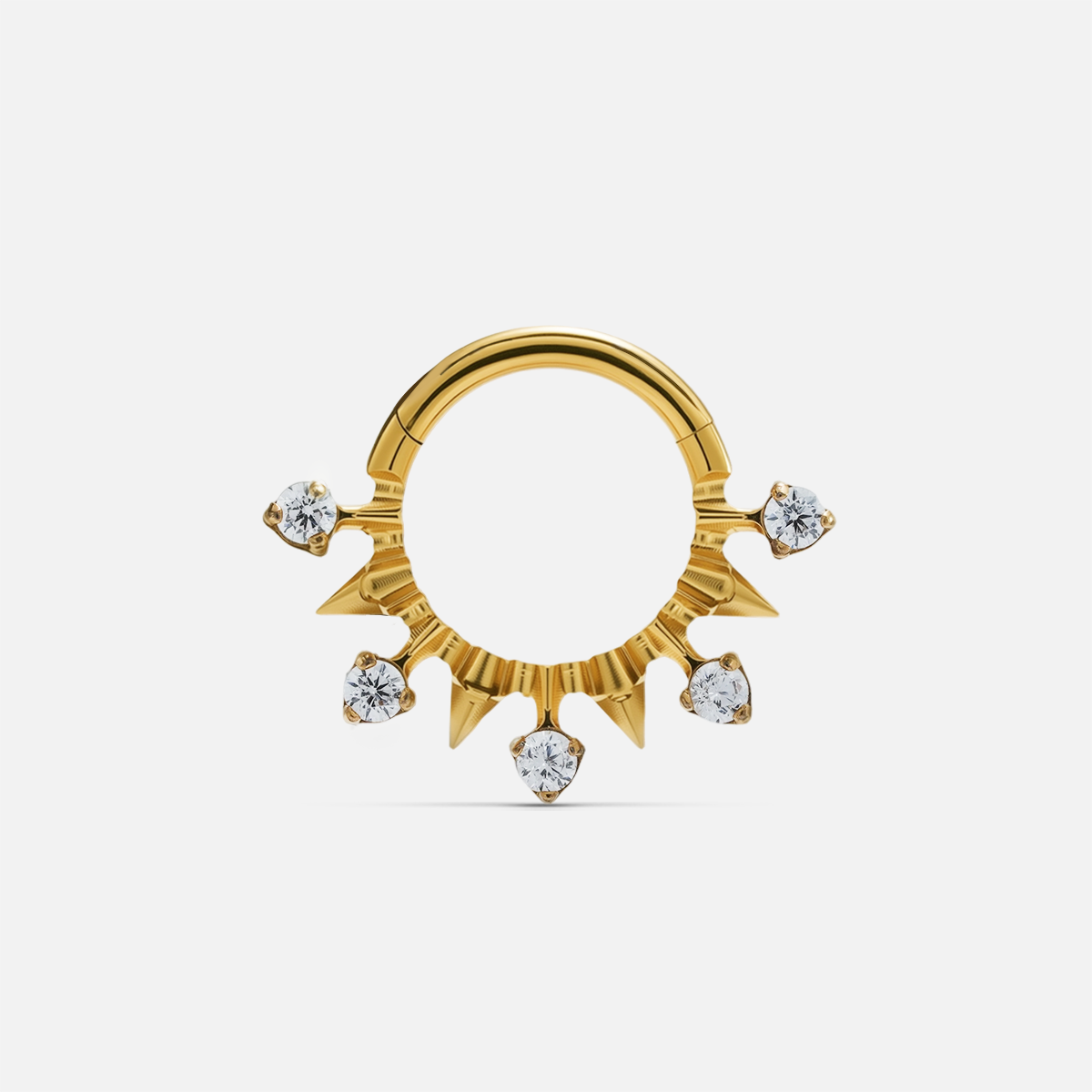 Spiked Radiance Clicker features a circular frame adorned with alternating spikes and zircon stones, merging sharp geometry with radiant brilliance. This item is sold individually.