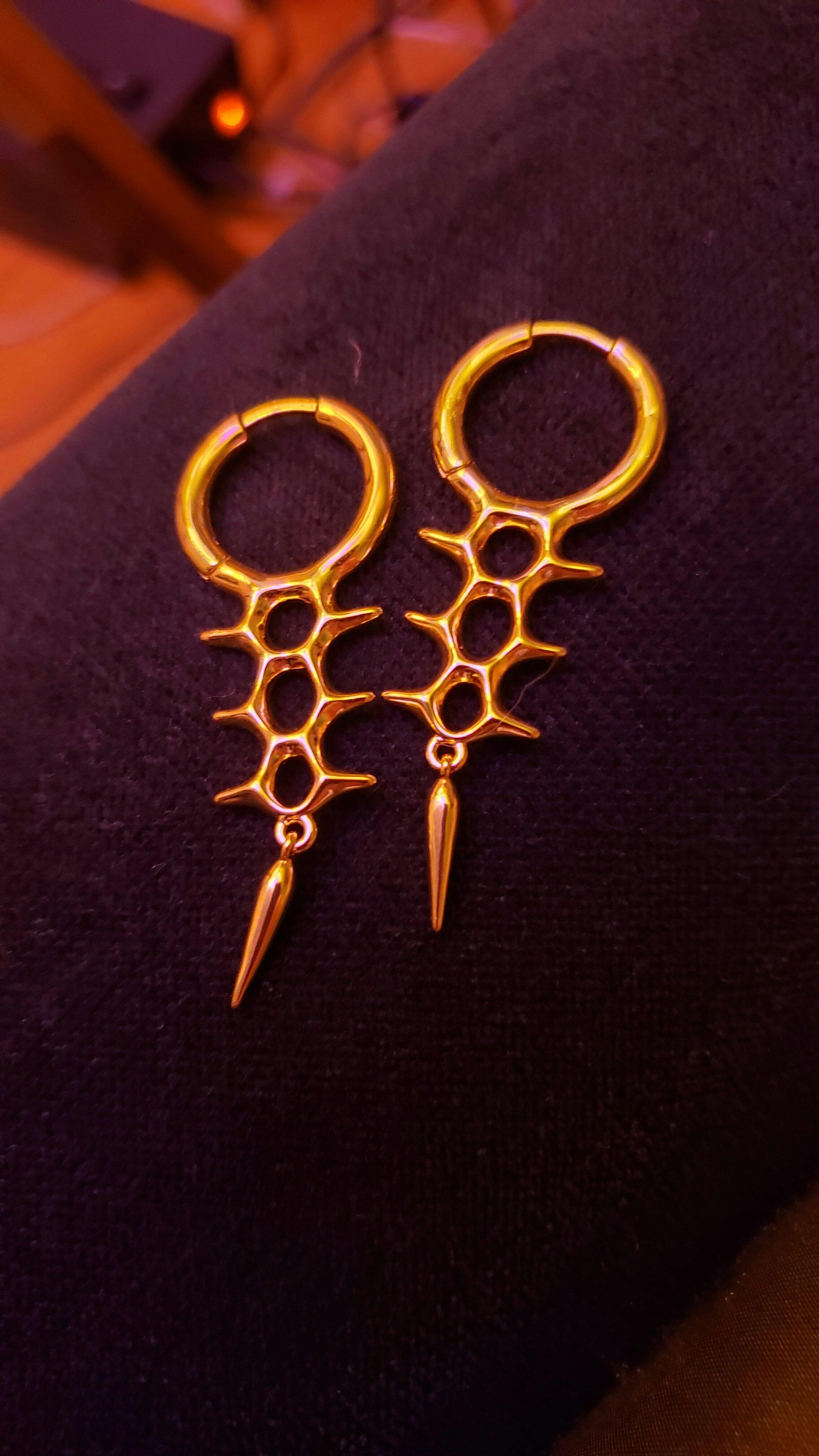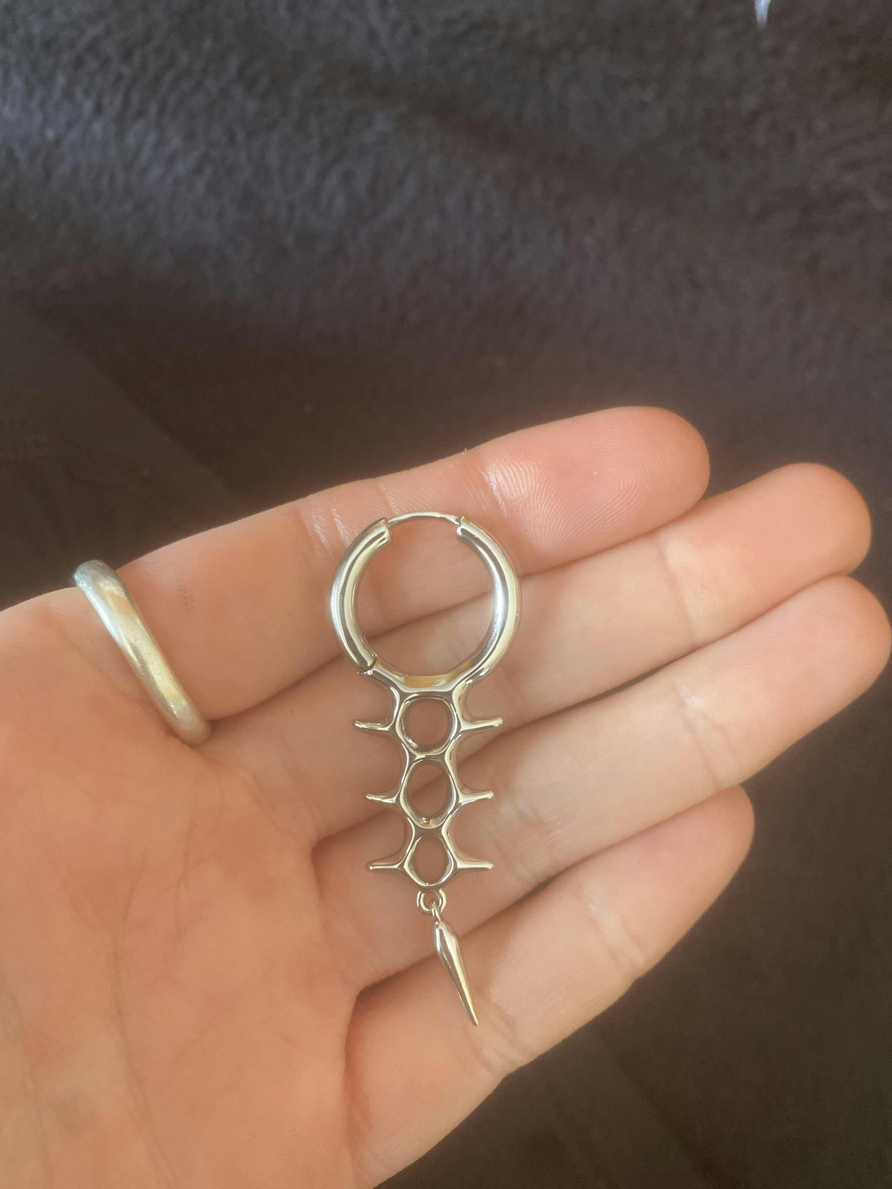 Sleek hoops paired with a spine-inspired structure and a polished spike drop, creating a clean biomech silhouette for modern piercings. This item is sold as a pair.