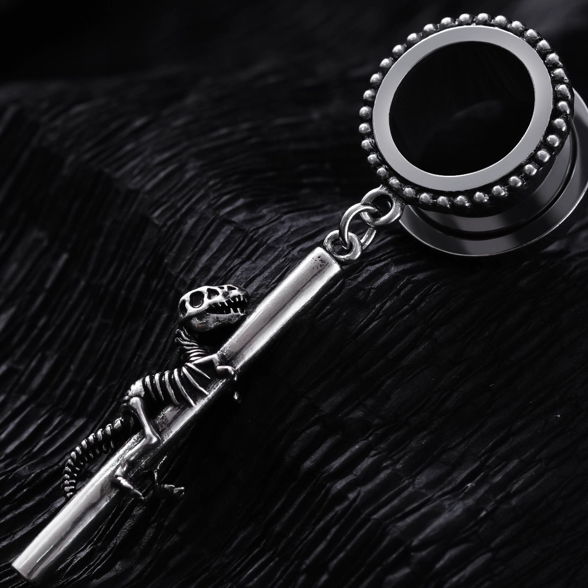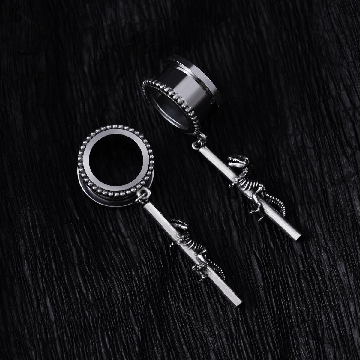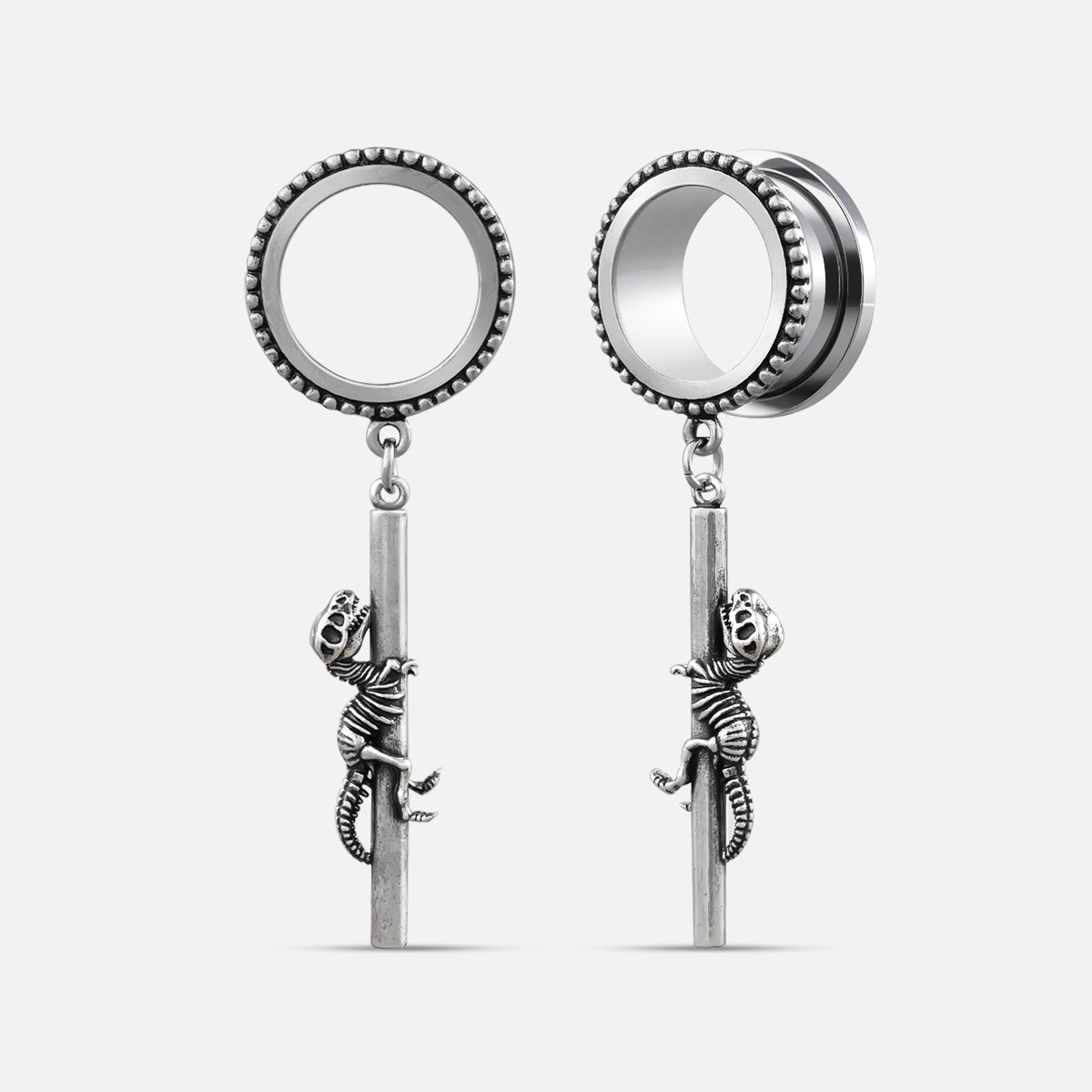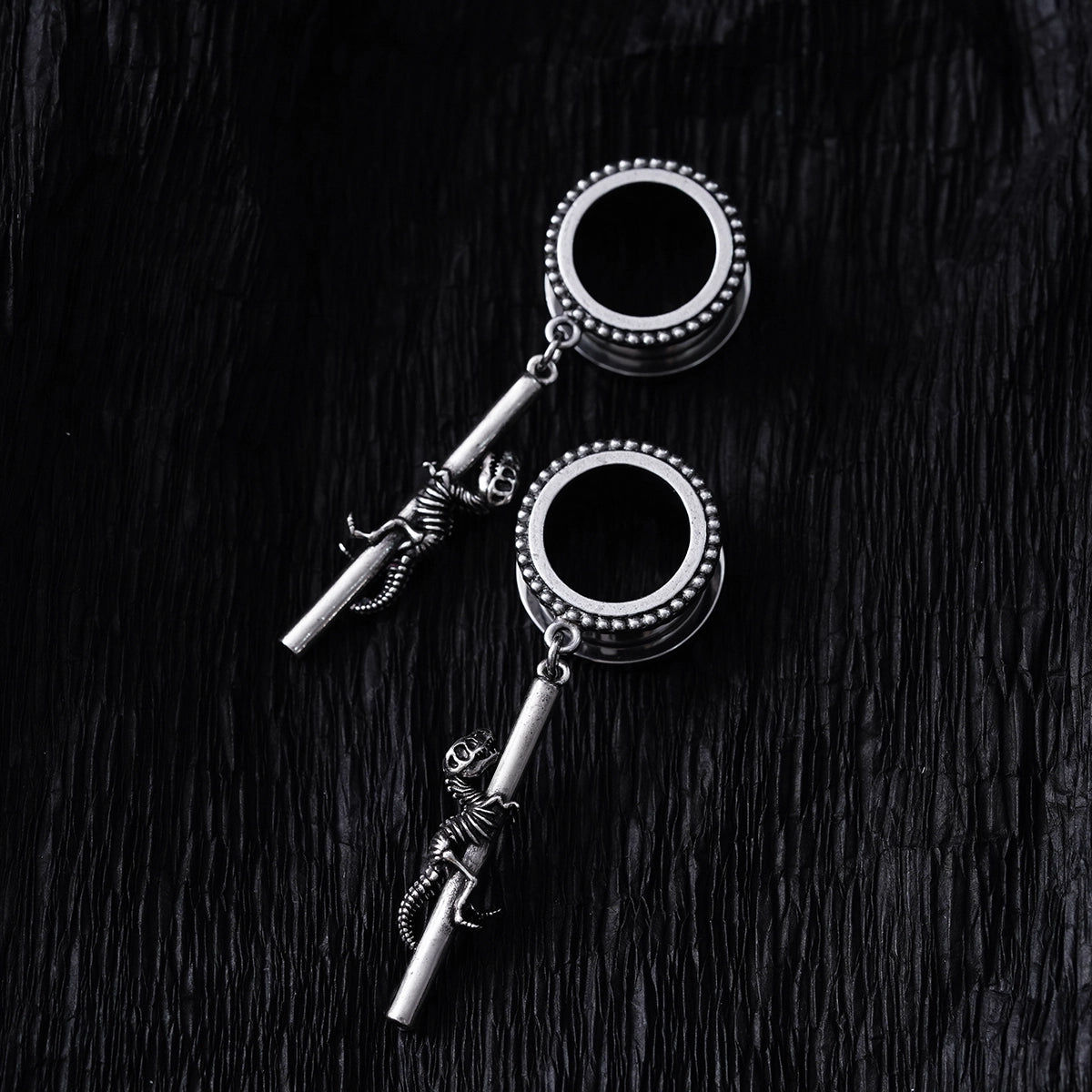 Ces pendentifs arborent des motifs complexes de fossiles de dinosaures, semblant grimper sur une barre métallique, offrant une esthétique unique. Cet article est vendu par paire.