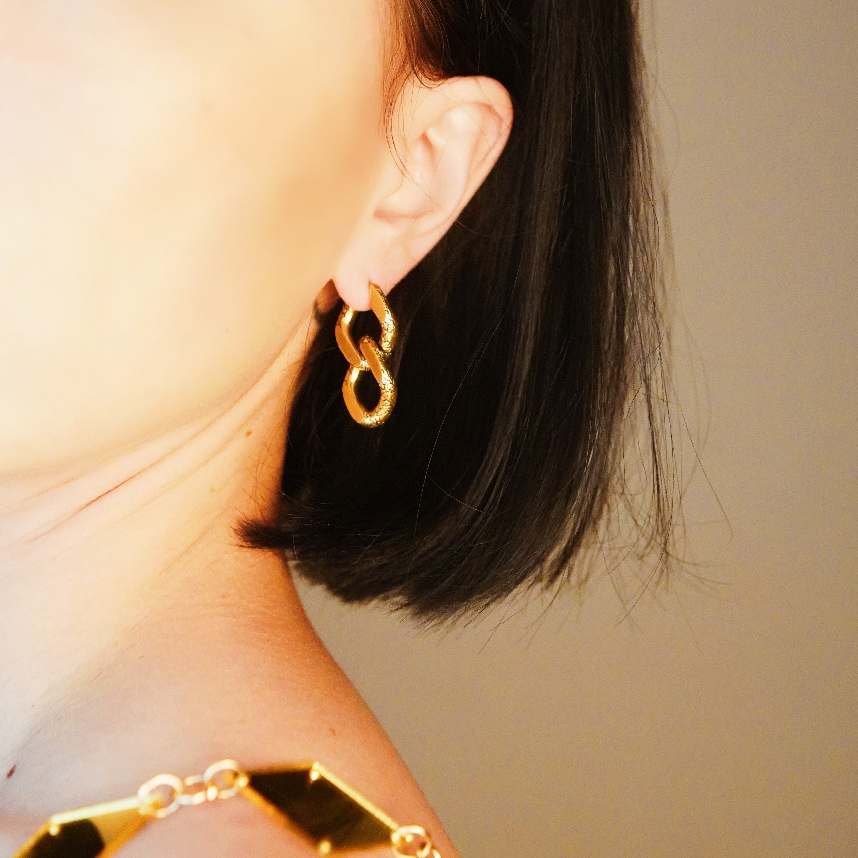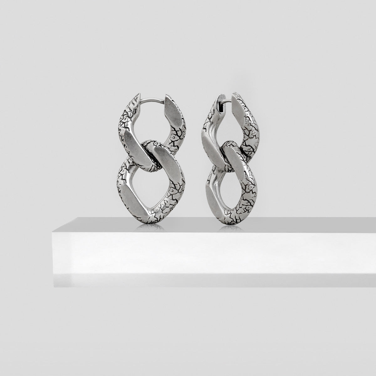 Ces boucles d'oreilles présentent une conception à maillons de chaîne robuste avec des textures complexes, mélangeant une esthétique moderne et classique. Cet article est vendu par paire.