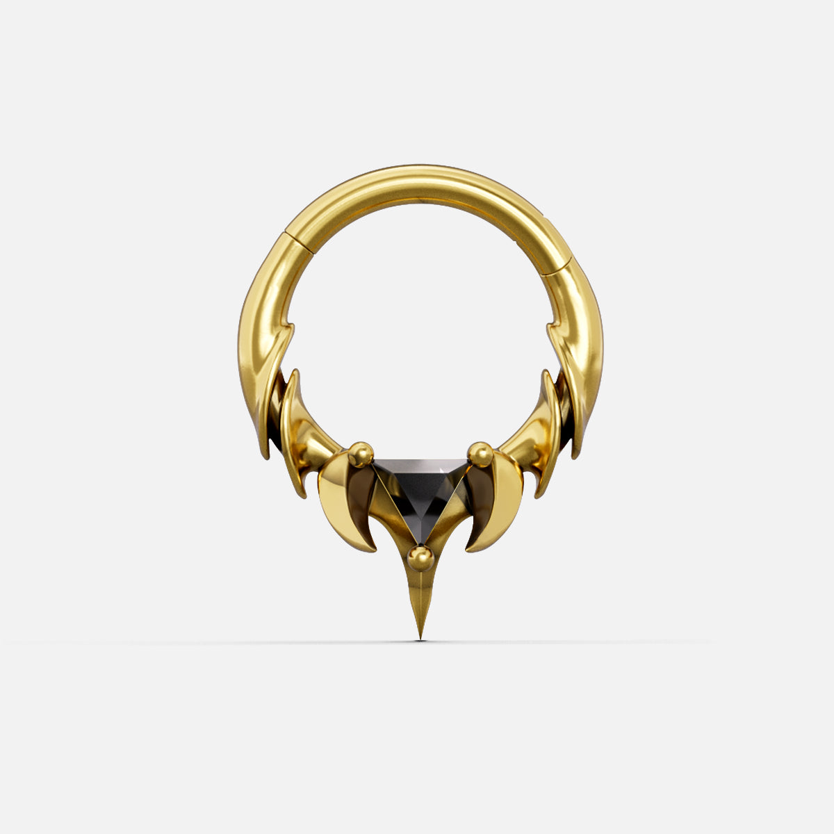 The Keystone Ridge Septum Clicker runs lifted ridge links along a tight arc, resolving at the base in a pronged seat for a triangle-cut stone above a tapered point. Openwork keeps weight low; edges taper for clean clearance—Spinal Bone logic in a compact clicker.