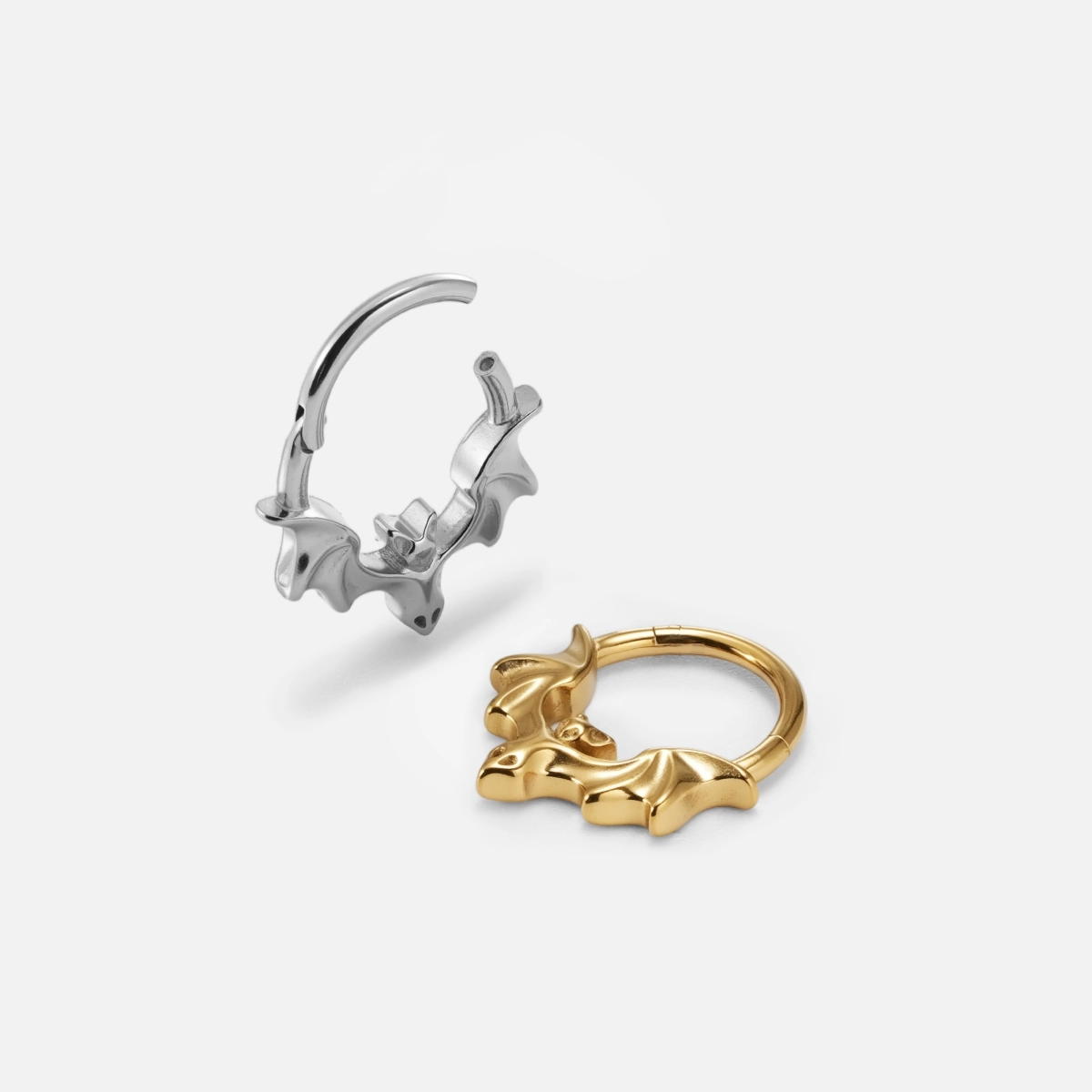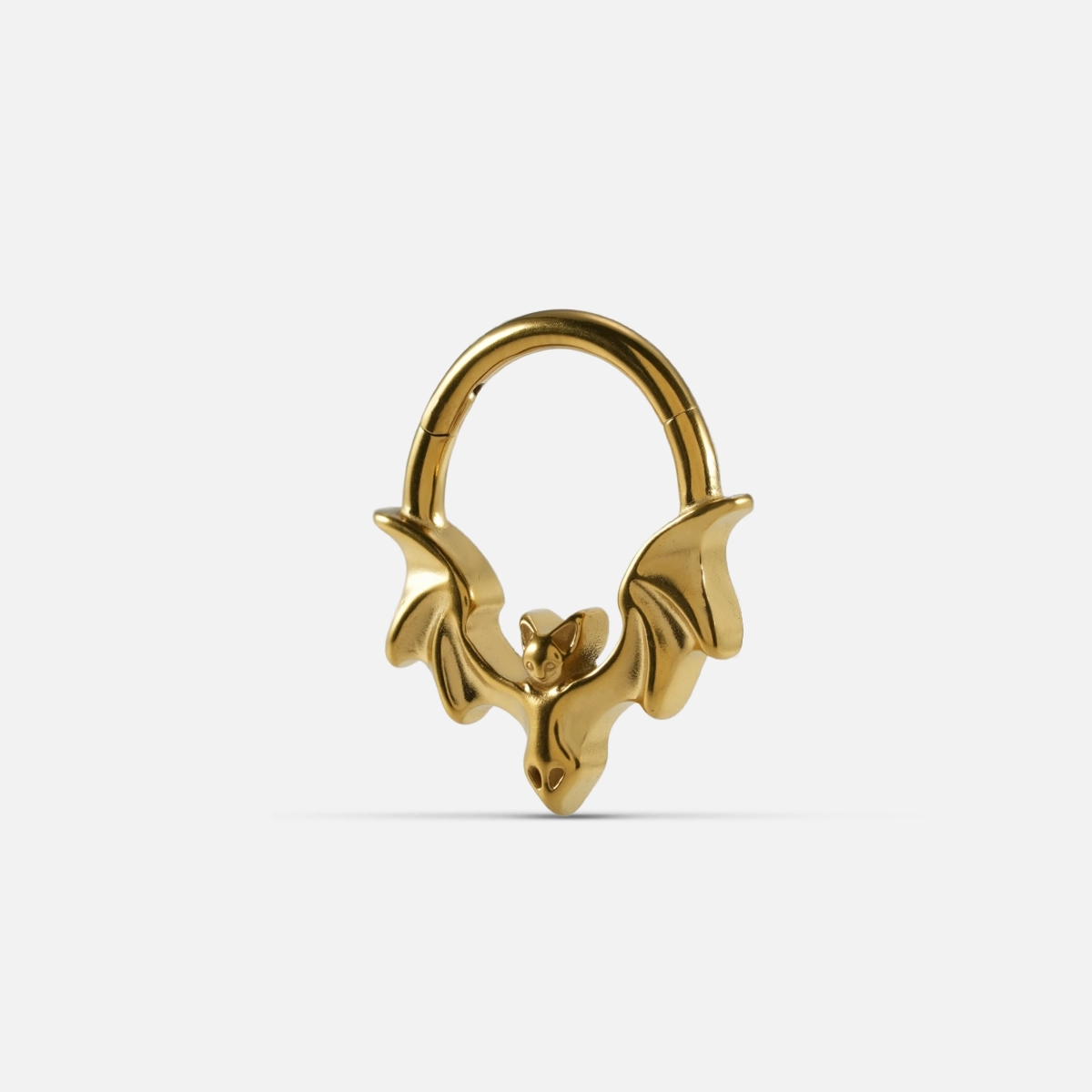 A sculpted bat form with outstretched wings creates a bold, gothic clicker ideal for septum and daith piercings. This item is sold individually.