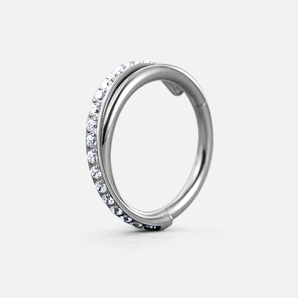 This septum piercing features an intricate entwined design, showcasing the brilliance of carefully set crystals. This item is sold individually.