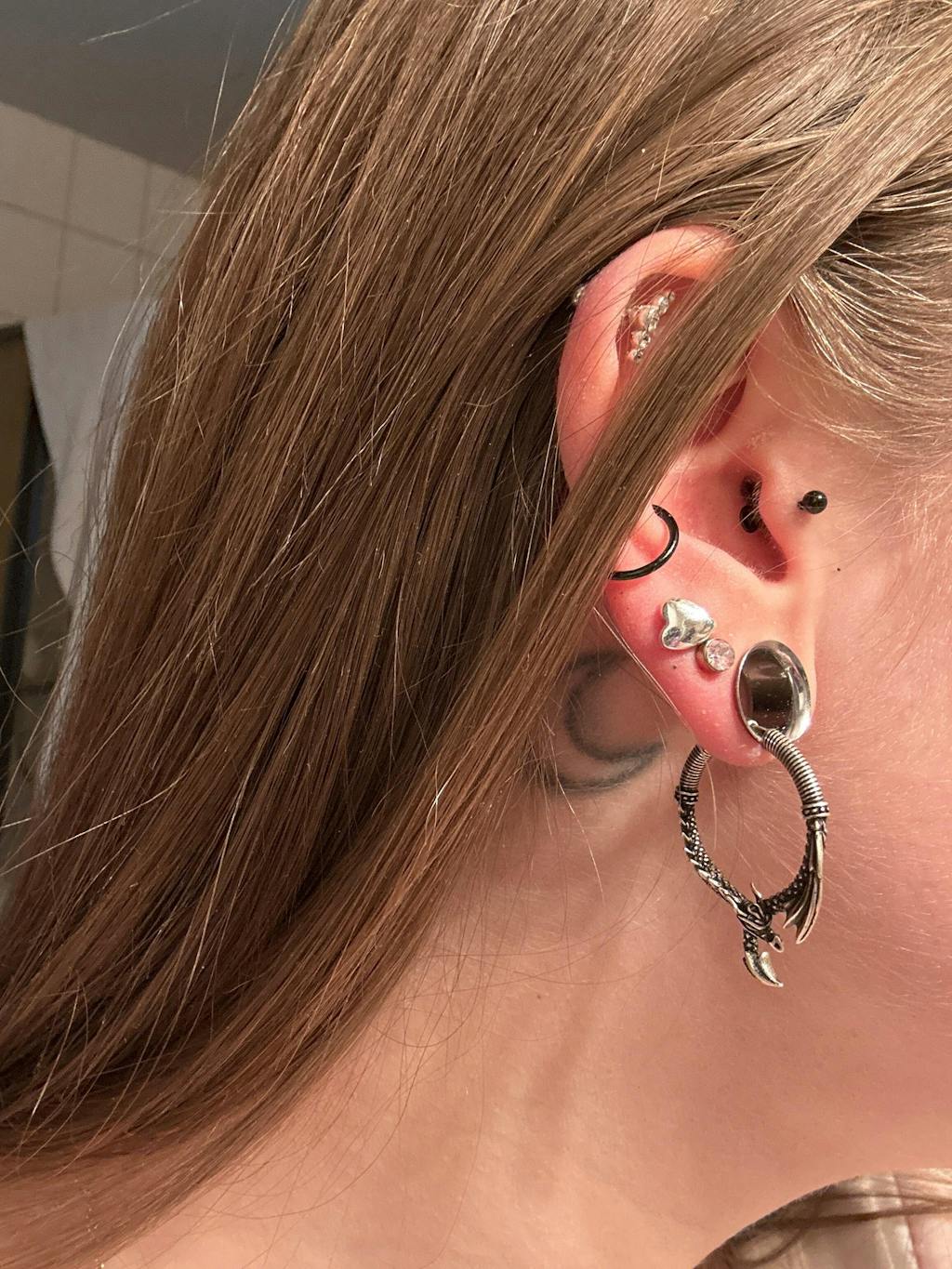 Intricately crafted dragon earrings with an antique silver finish, featuring a coiled, detailed design. Perfect for various piercing styles like lobe and cartilage, adding a bold, mystical touch. This item is sold as a pair.