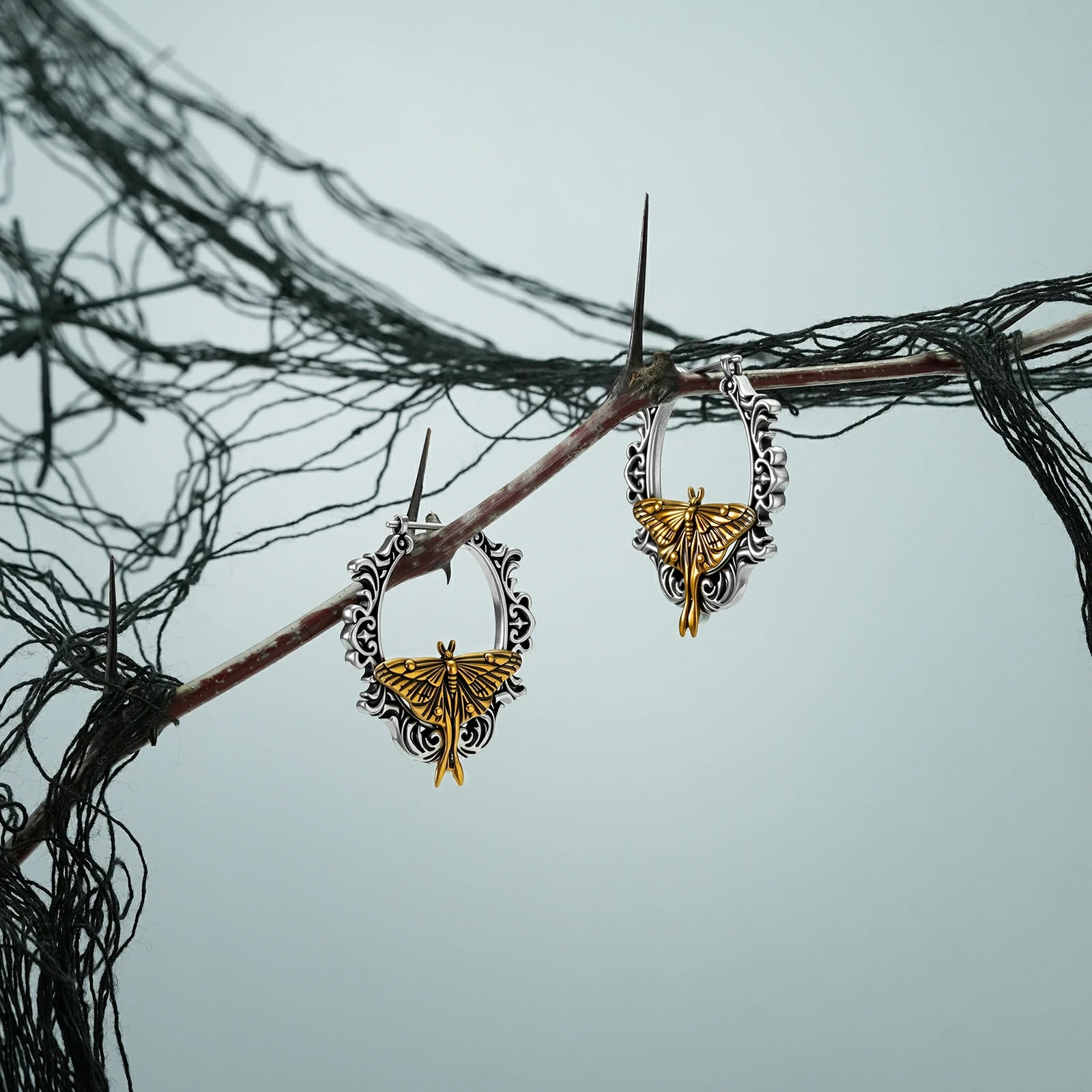 Baroque Moth Earrings feature an ornate metallic frame crowned with a golden moth, blending gothic filigree and baroque curves into a regal and mysterious silhouette. This item is sold as a pair.