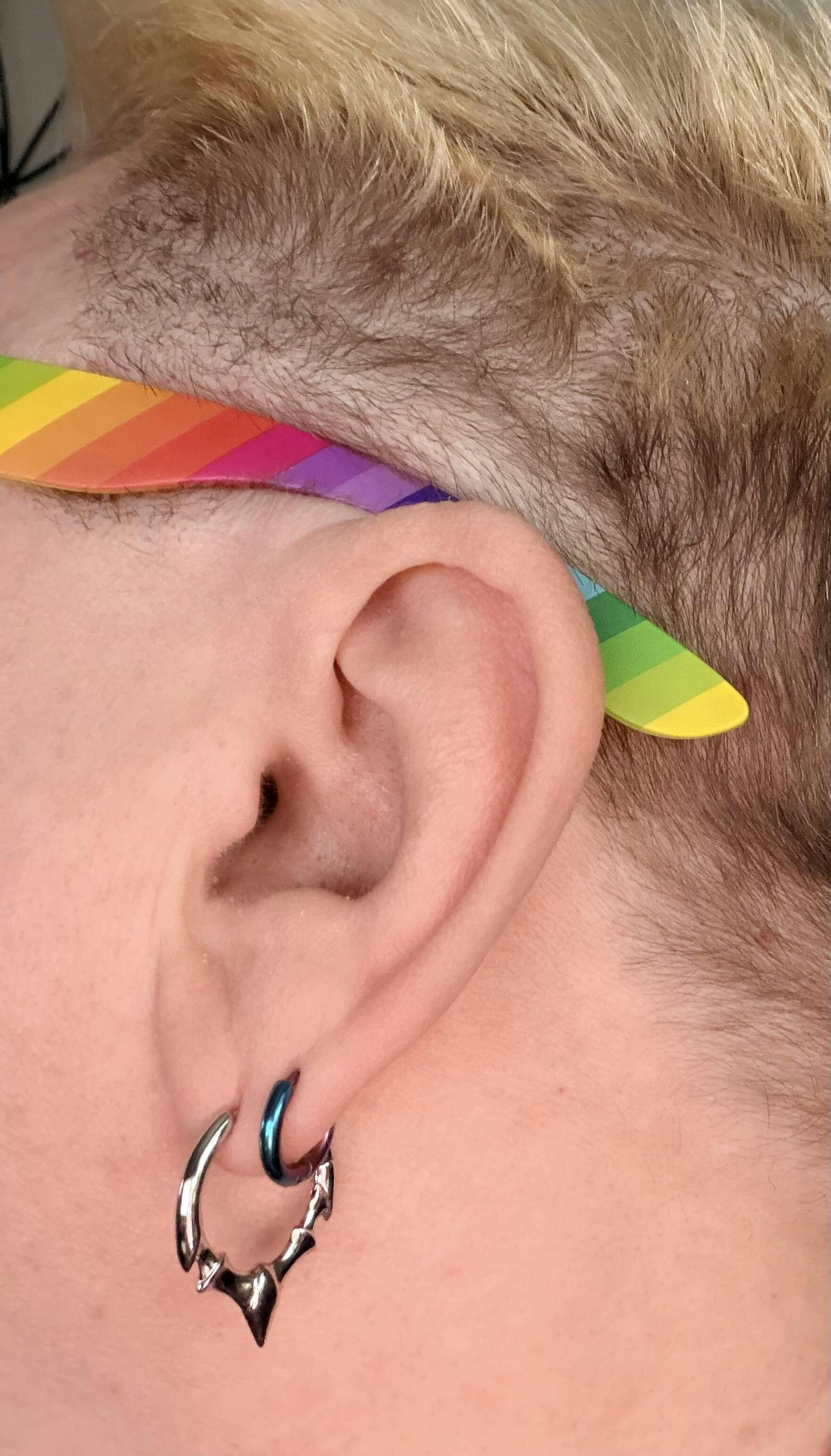 The Fang Crest Hoop Earrings set ridge segments along a compact circle, tightening into a tapered point at the base. The hinge seats cleanly; mass stays low, so the profile reads sharp without bulk.