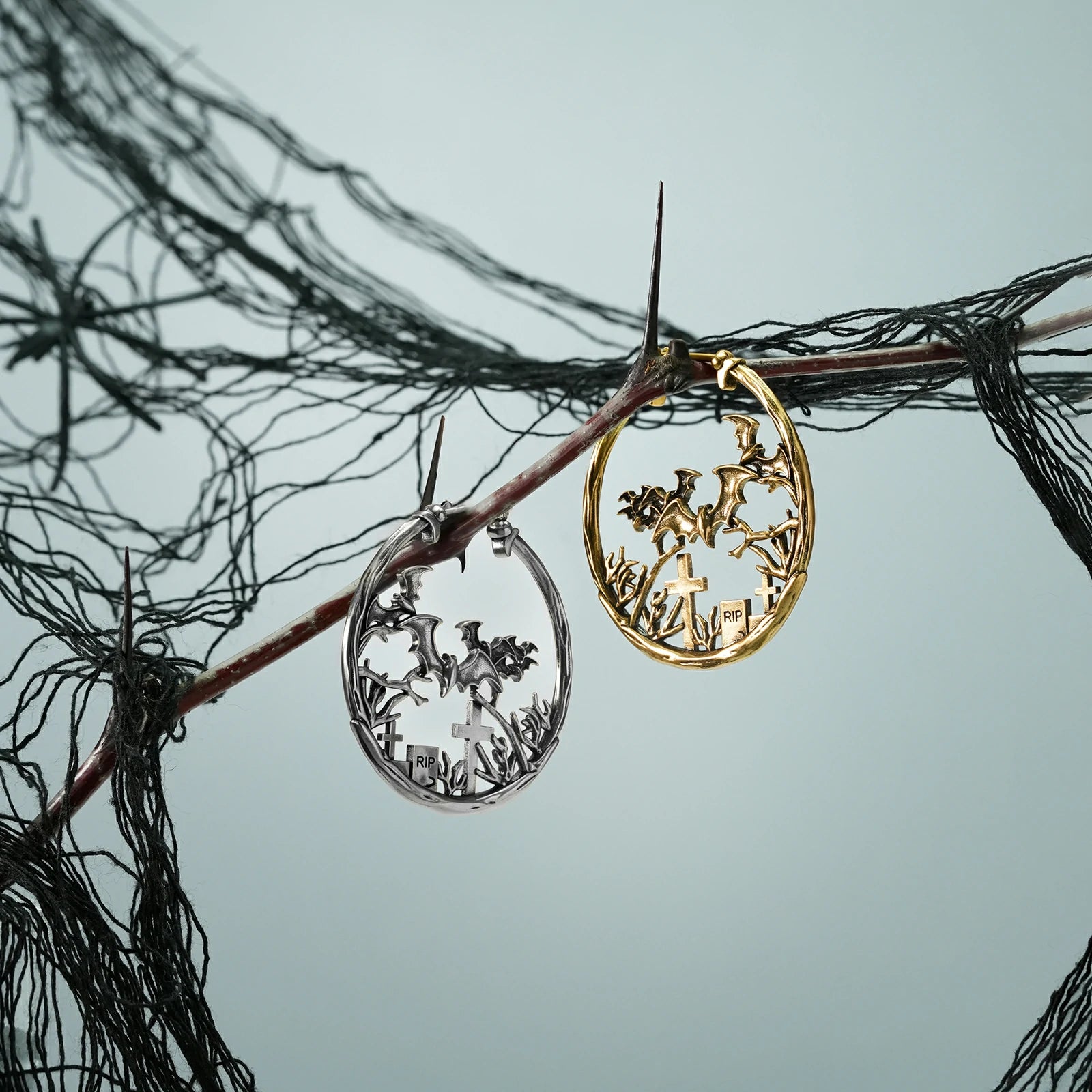 Graveyard Bat Earrings feature a circular frame with flying bats, crosses, and branches, capturing a haunting yet elegant gothic scene. This item is sold as a pair.