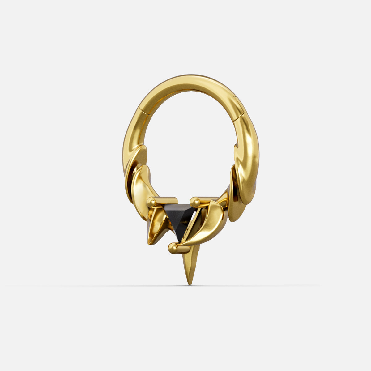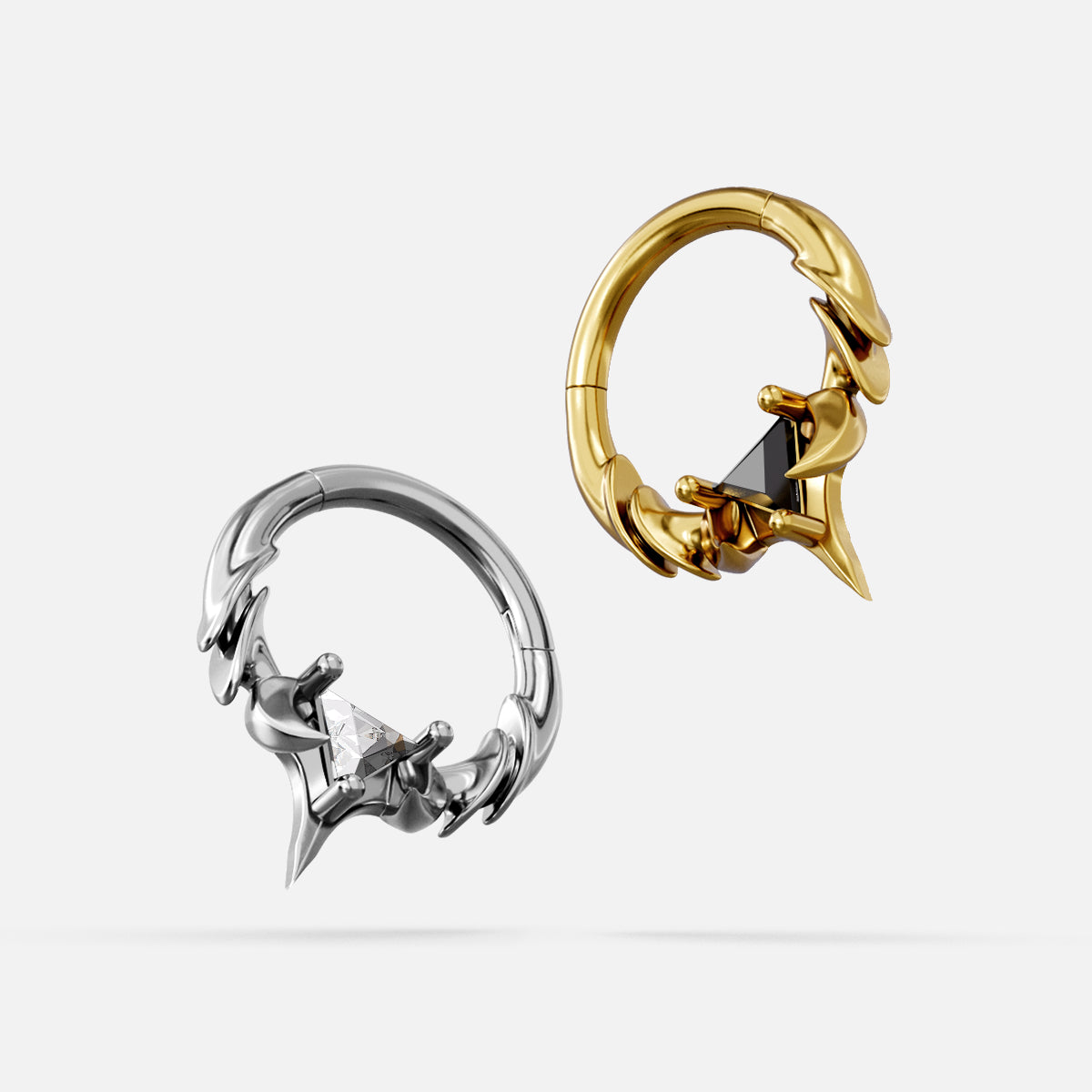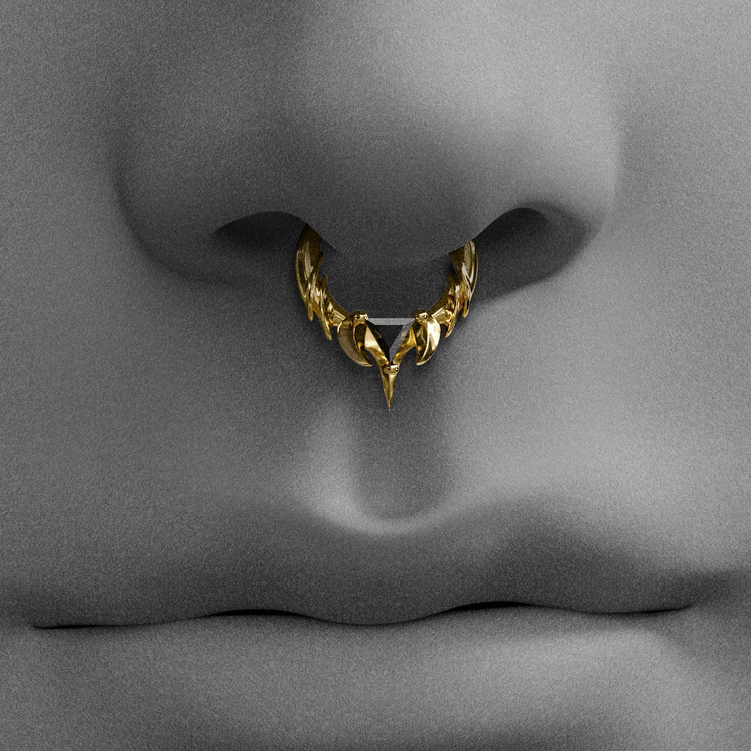 The Keystone Ridge Septum Clicker runs lifted ridge links along a tight arc, resolving at the base in a pronged seat for a triangle-cut stone above a tapered point. Openwork keeps weight low; edges taper for clean clearance—Spinal Bone logic in a compact clicker.
