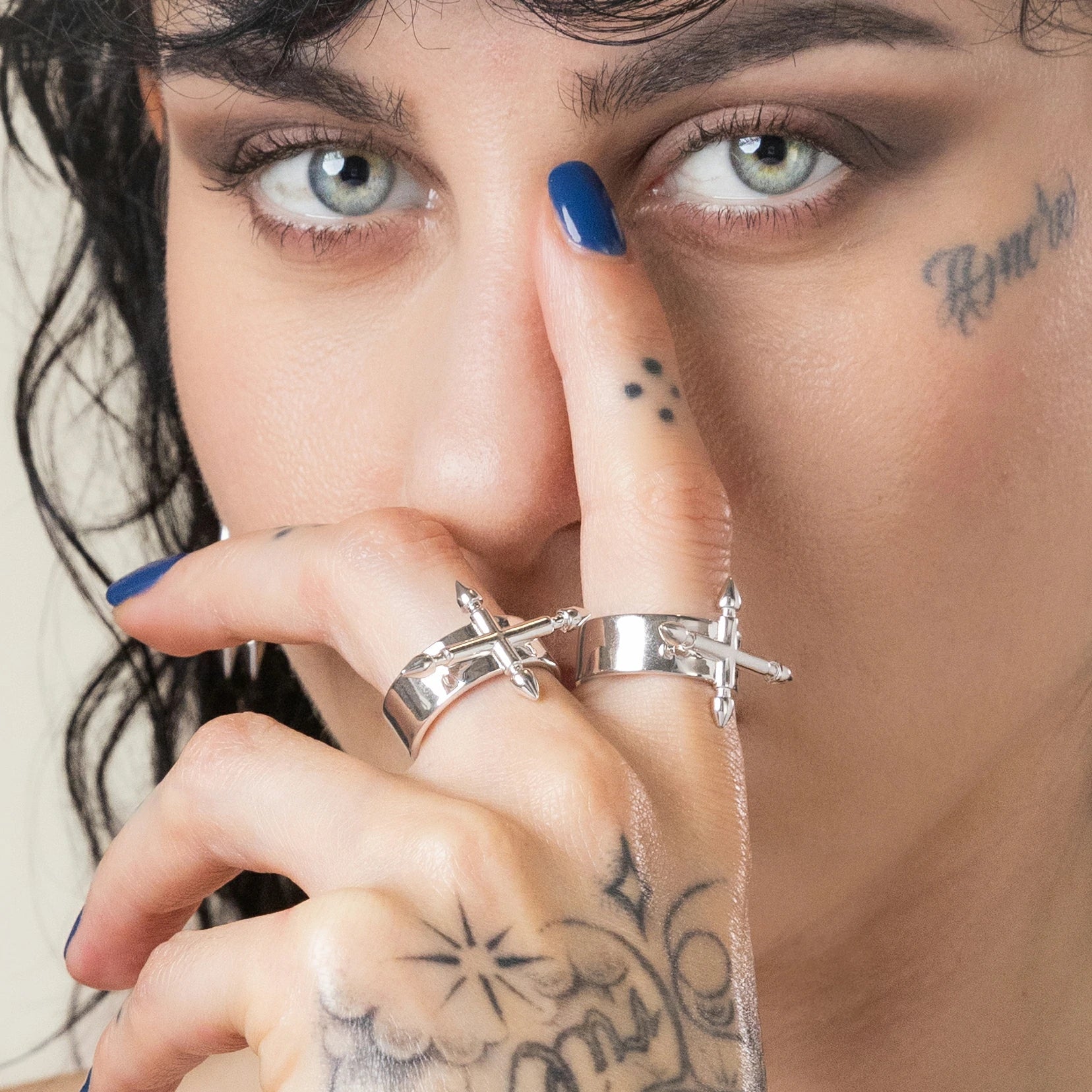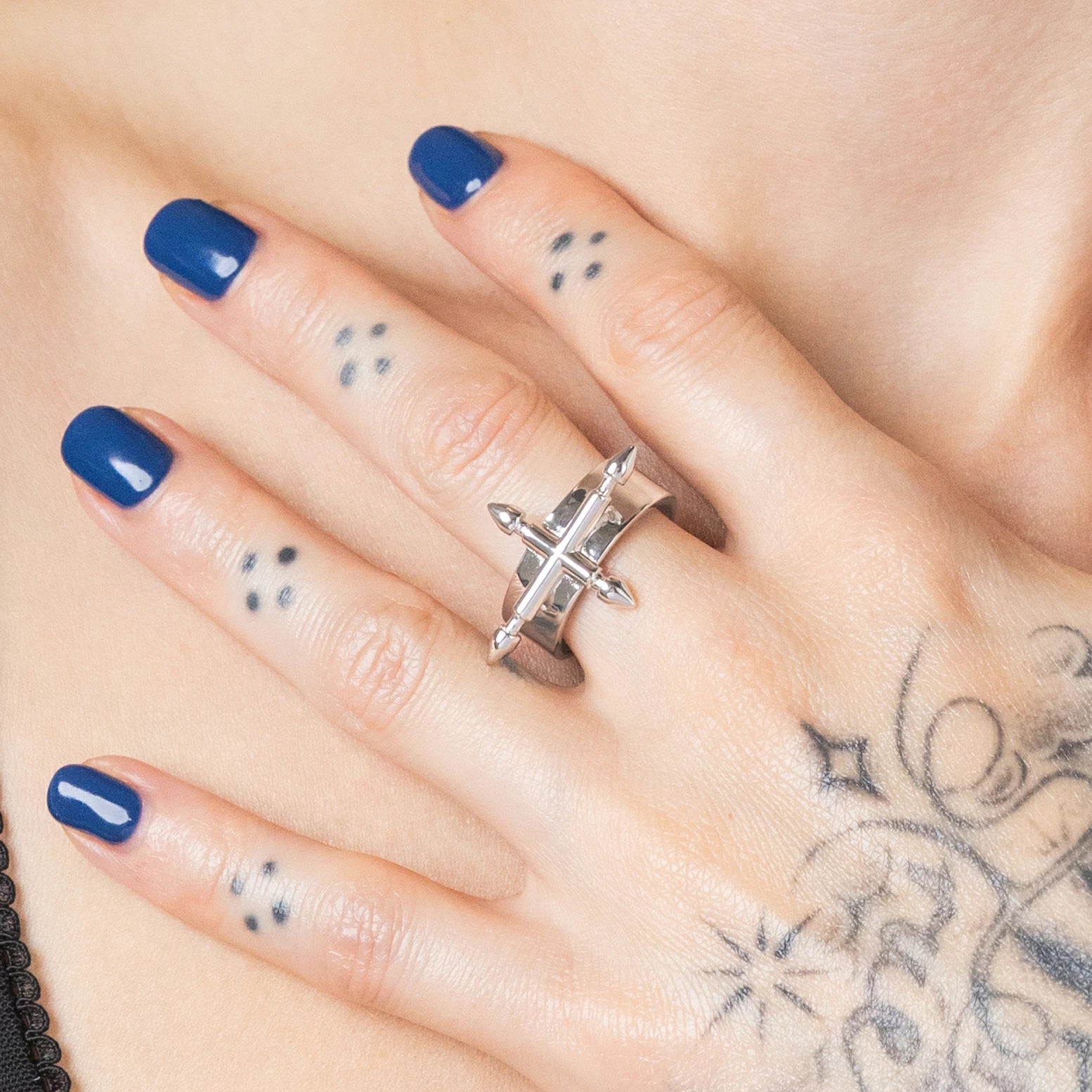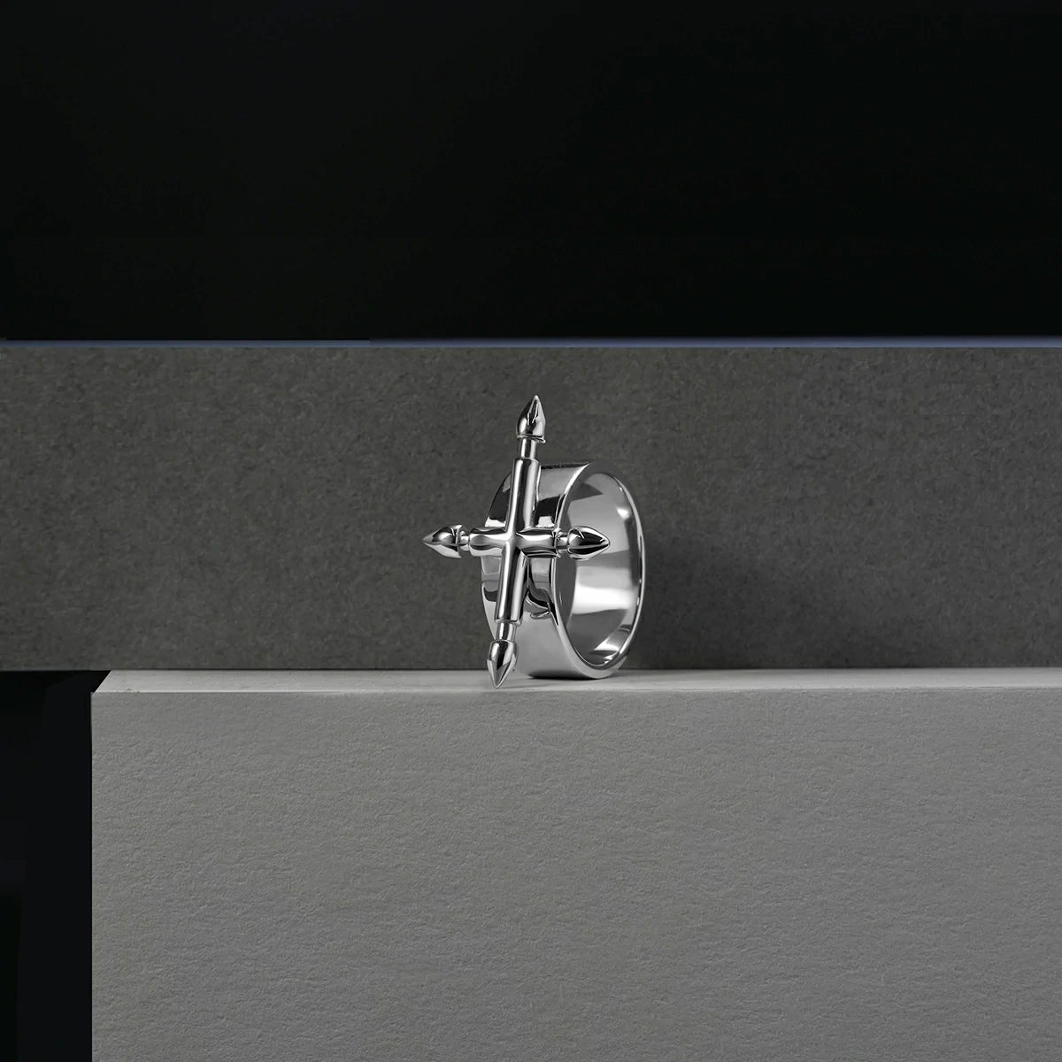 The Spire Axis Ring defines Spire Thorn’s geometry—a cross of intersecting rods balanced on a wide, solid band. Polished spheres and directional spikes form symmetry that feels mechanical yet composed.
