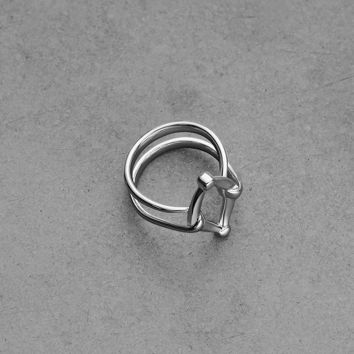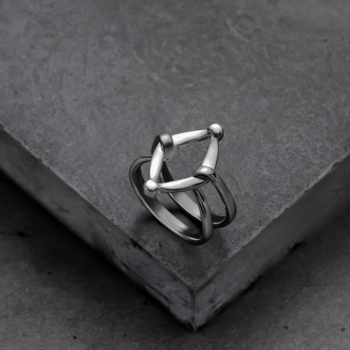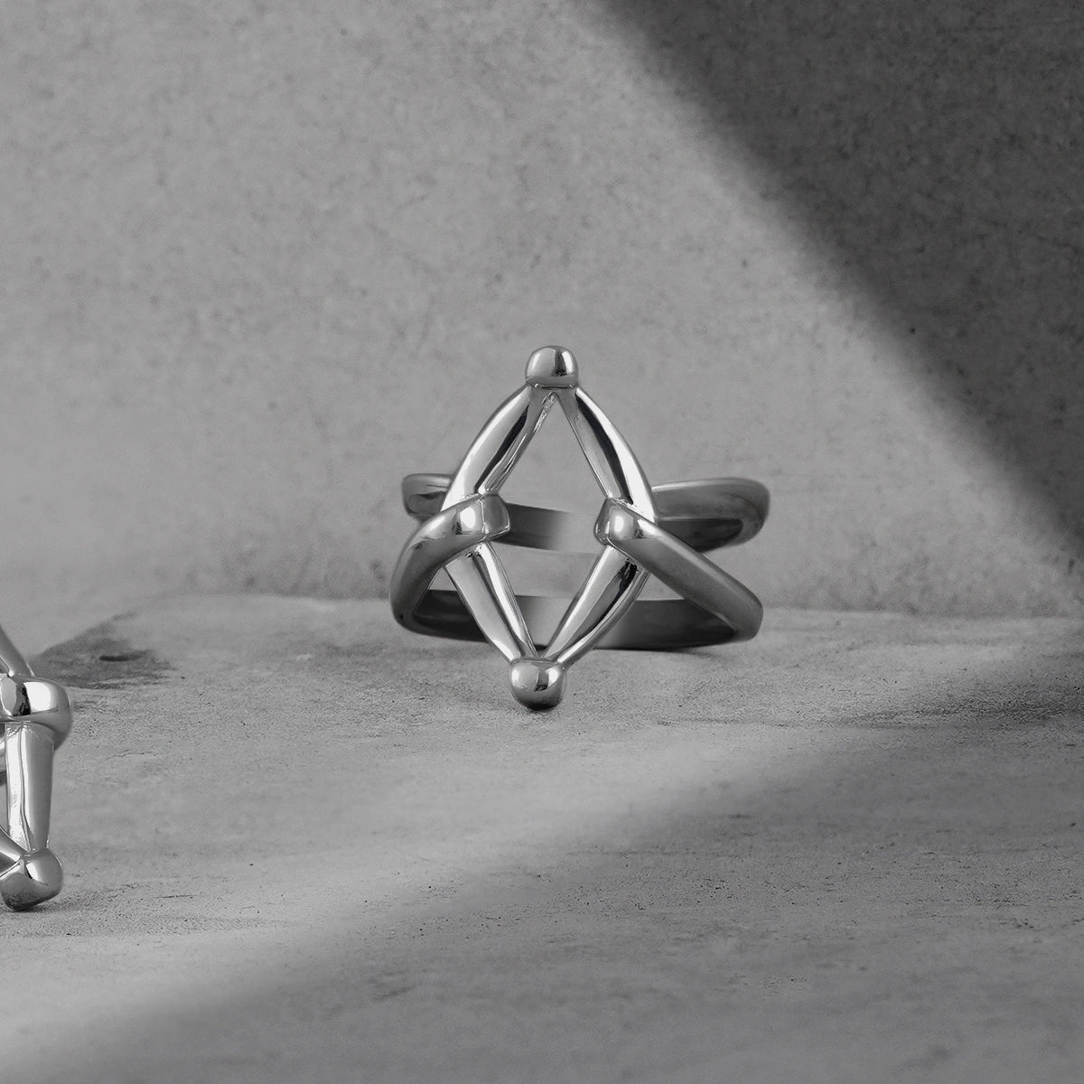 Tension Link Ring spans two fingers with curved metal arms joined in a diamond-like form, blending symmetry and suspension. This item is sold individually.