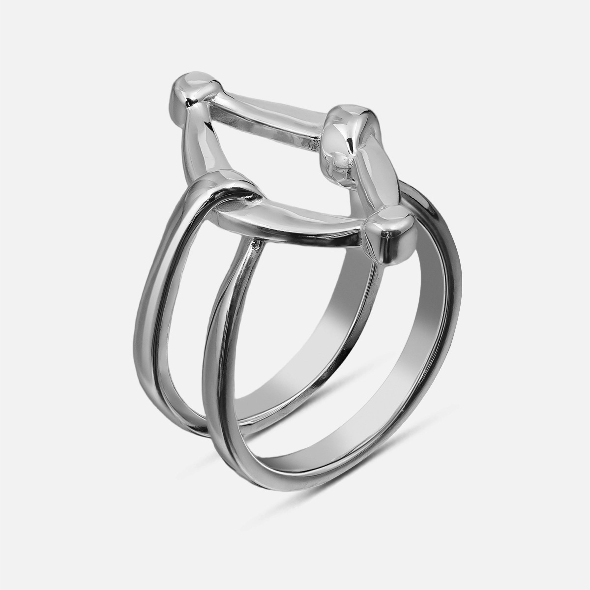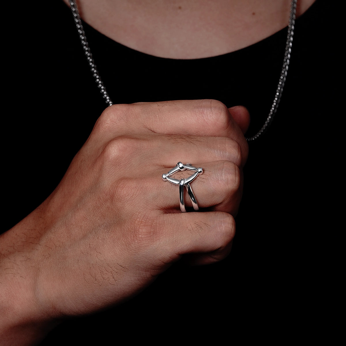 Ideal for lovers of dual-finger rings, architectural design, and sculptural edge.