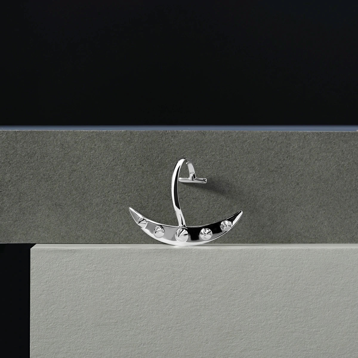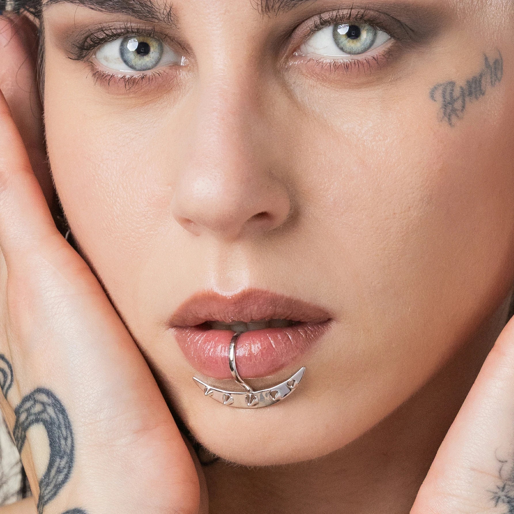 The Thorn Arc Lip Cuff draws a precise crescent that follows the curve of the mouth. Five sculpted spikes align in measured rhythm, each one deliberate, each point held in balance. Designed to rest with tension—not pressure—it remains secure by its own geometry. The form feels anatomical, built for symmetry and quiet control.