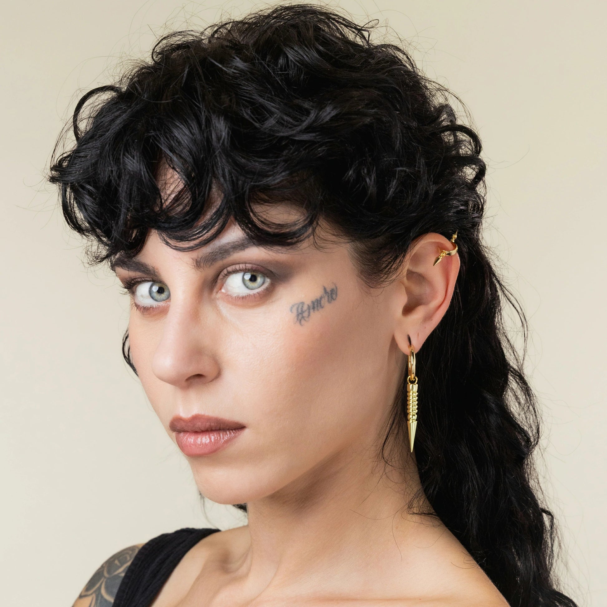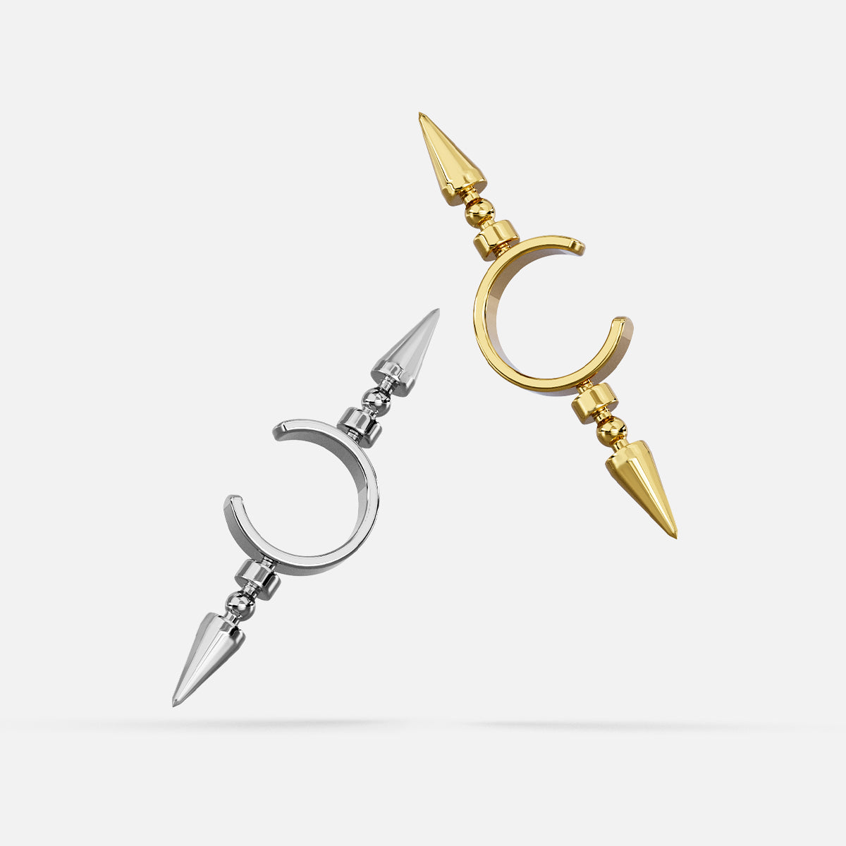 The Thorn Bar Ear Cuffs distills Spire Thorn into its simplest form—an open band balanced by two opposed spikes. Each end mirrors the other across a clean arc, joined by mechanical segments that read as rhythm and restraint. The fit feels engineered: open tension that holds, geometry that adapts without excess. Worn across fingers or joints, it’s a controlled statement of symmetry.