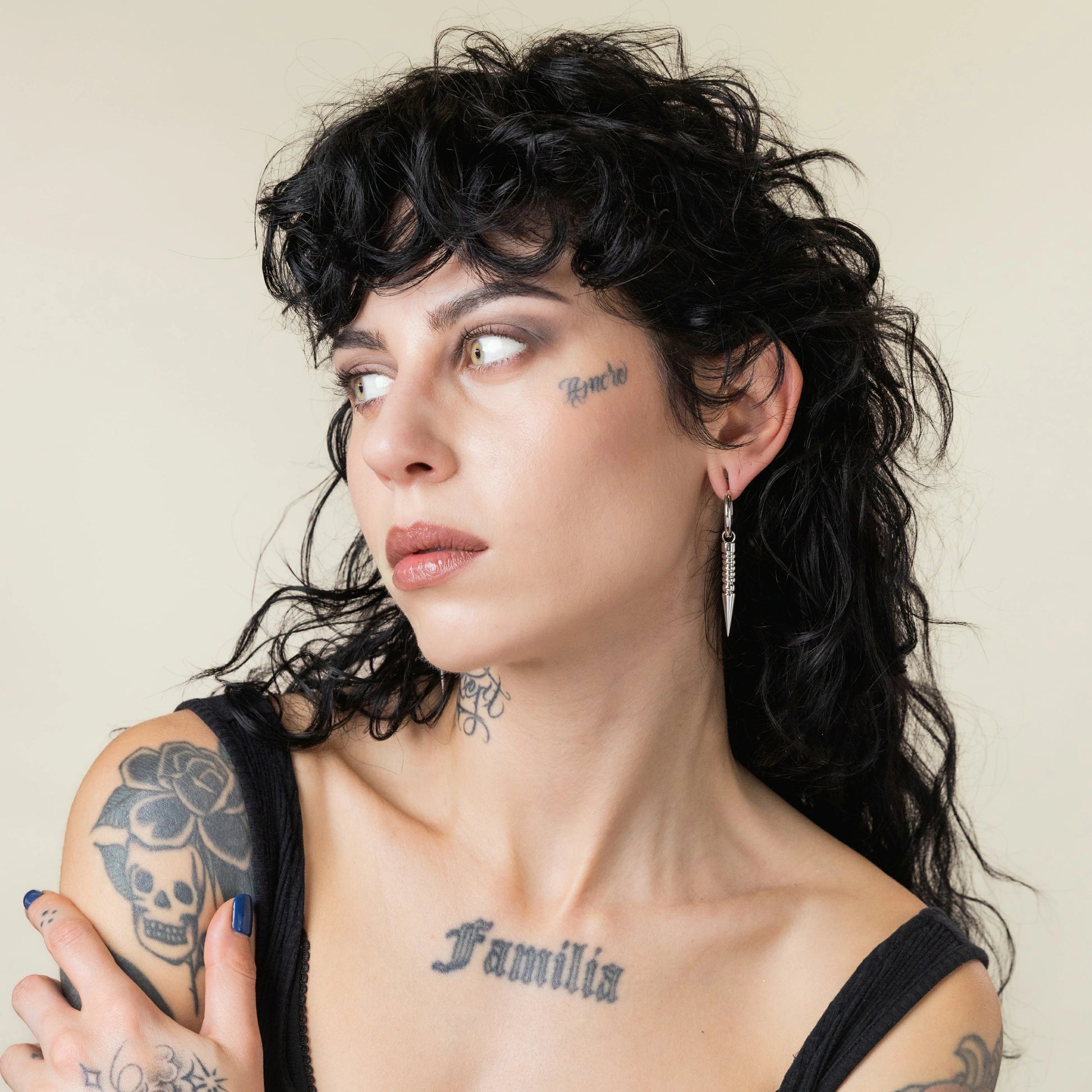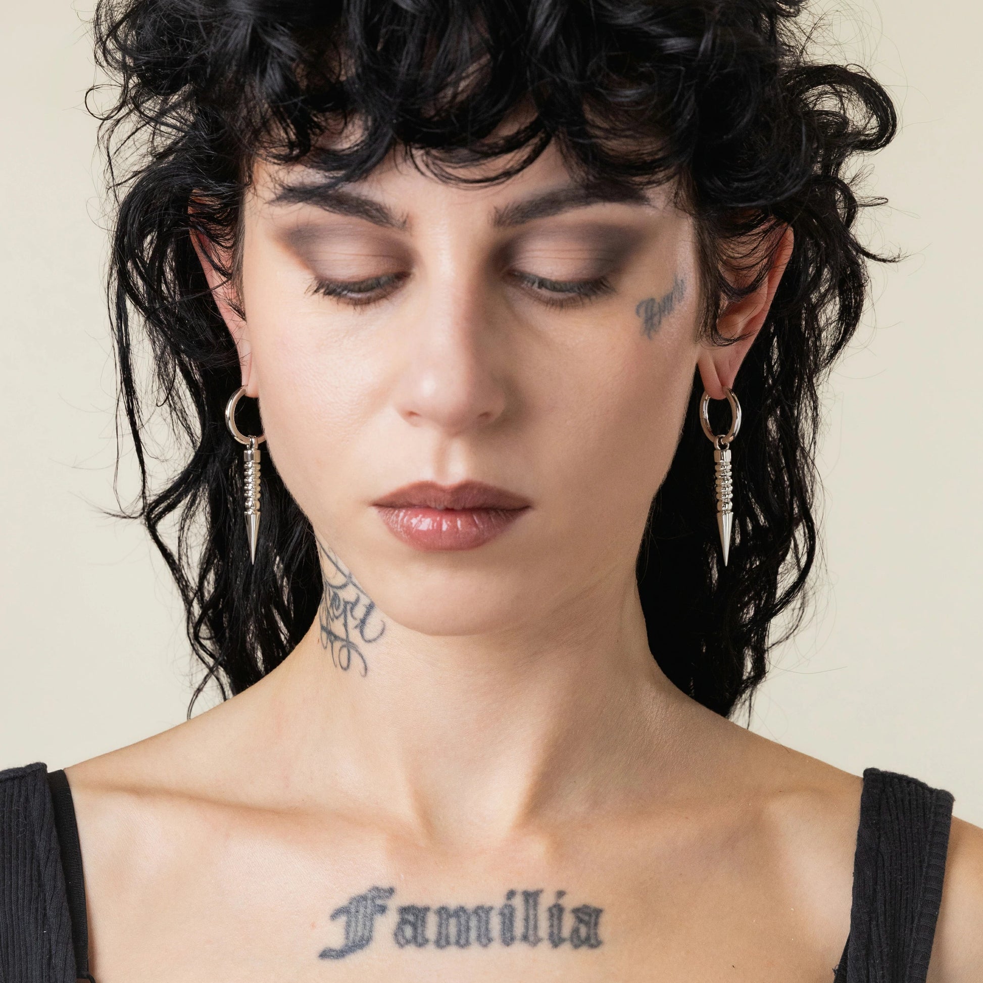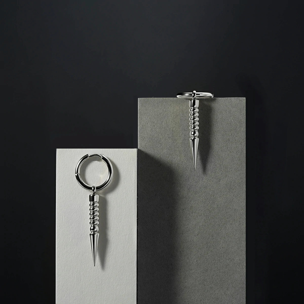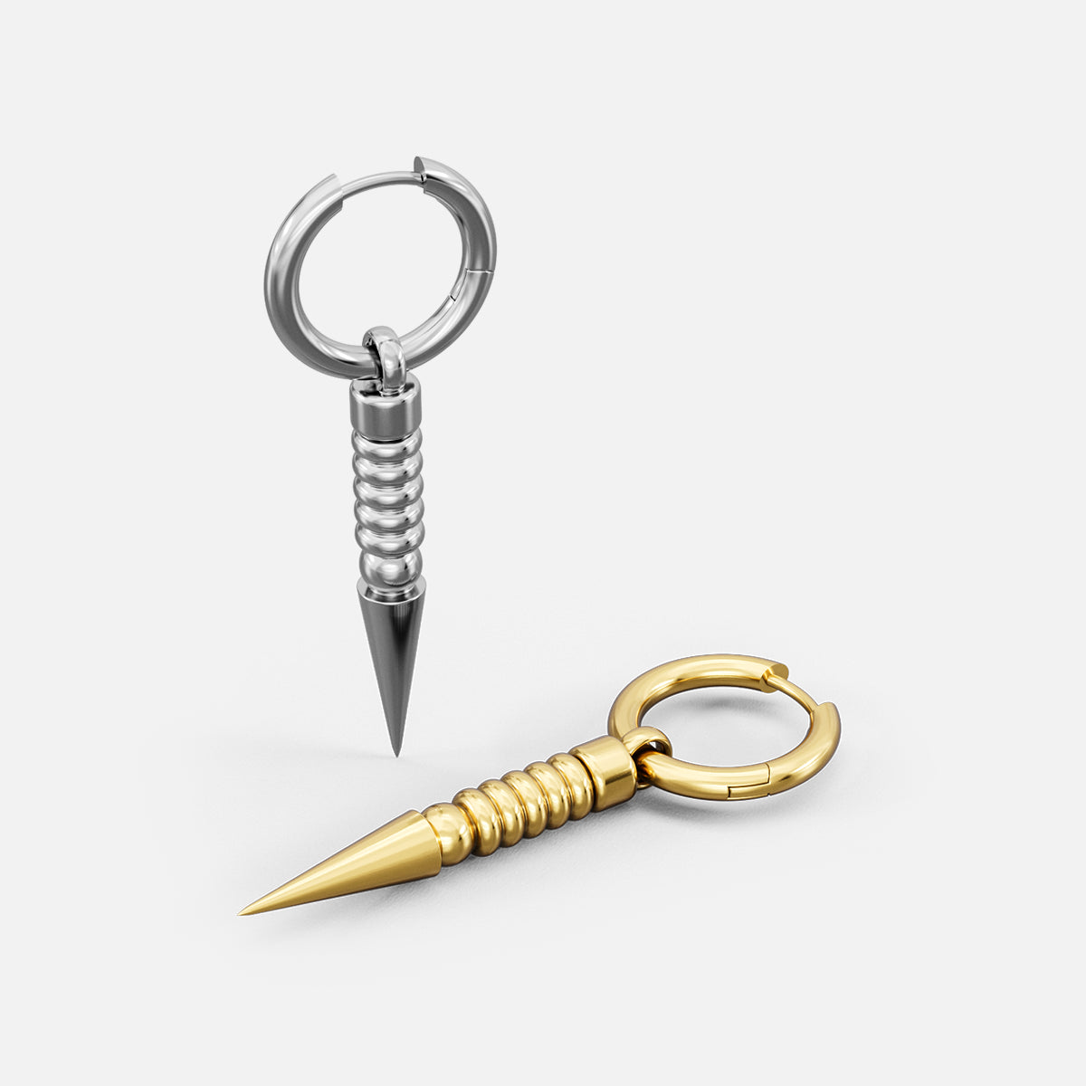 The Thorn Drop Hoops extend the circle into a point of precision. A ribbed stem descends from the hinge hoop, tapering into a sharp cone that draws the line downward with control. Balanced weight and clean articulation keep the motion deliberate, never loose. On the ear, they read vertical and exact—geometry held in tension.