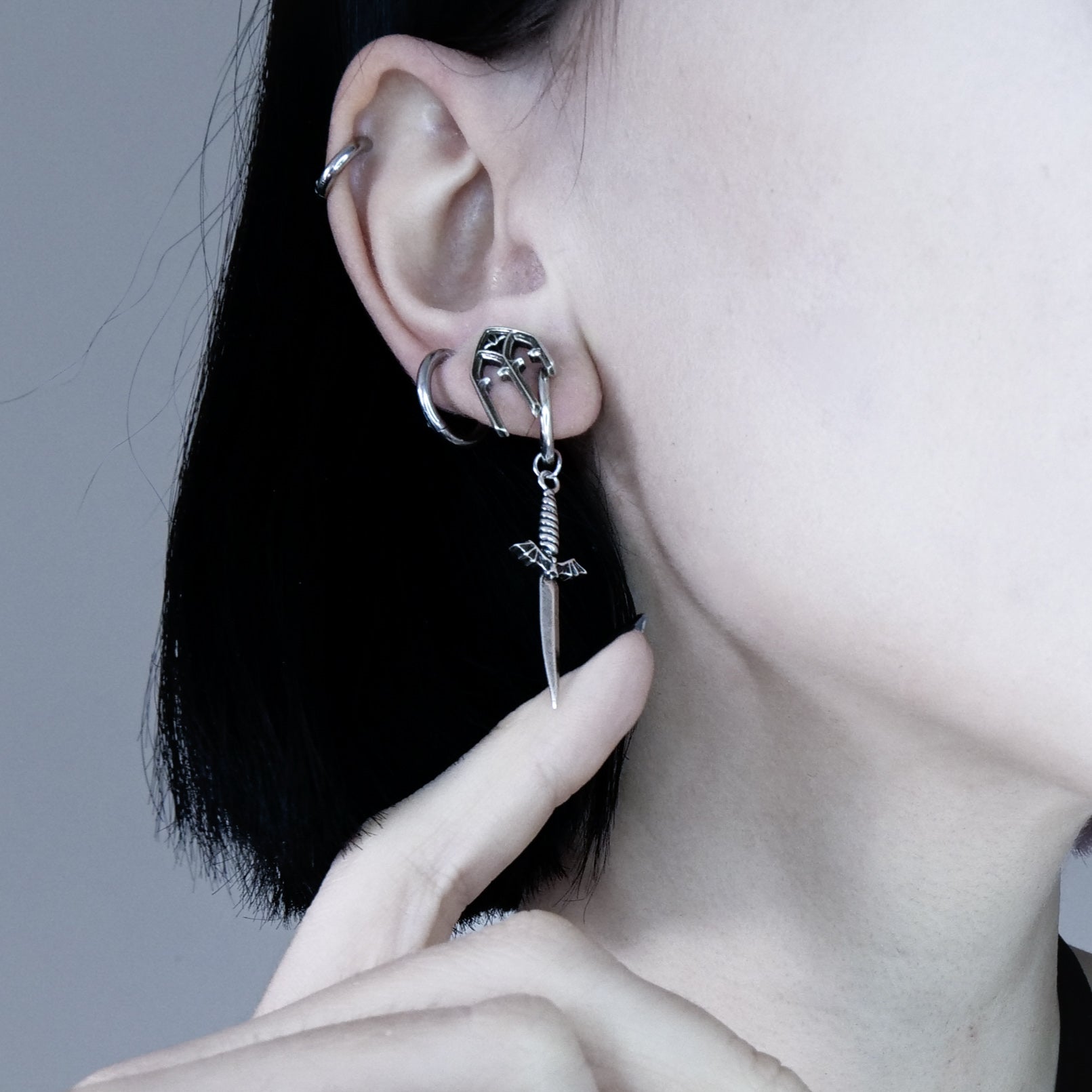 These earrings feature a striking design with a delicate sword and bat wing motif, blending elegance with edge.This item is sold as a pair.