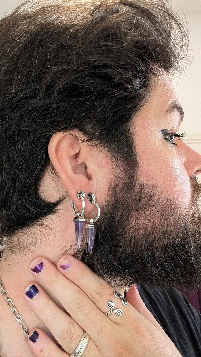 This earring features a unique amethyst shape, combining geometric design with natural elements, showcasing a perfect balance of elegance and individuality. This item is sold as a pair.