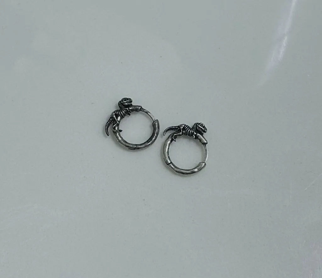 The earrings feature a detailed dinosaur skeleton wrapped around a circular hoop, creating a striking and unique look.This item is sold as a pair.
