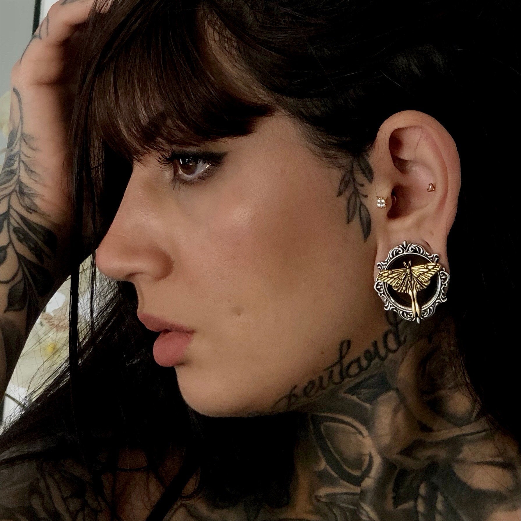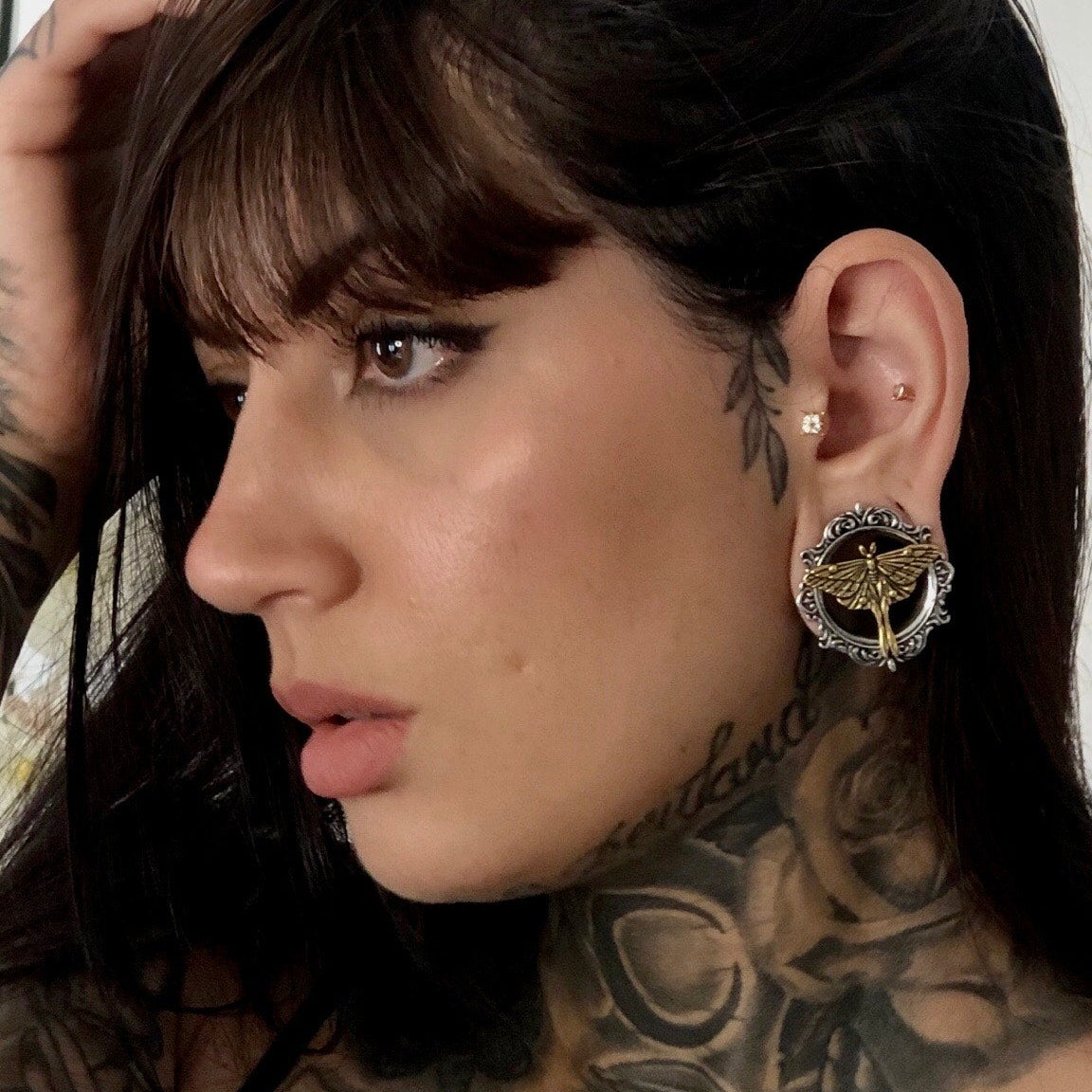 Intricately designed with ornate silver and a gold moth centerpiece, these tunnels blend classical elegance with modern flair. This item is sold as a pair.