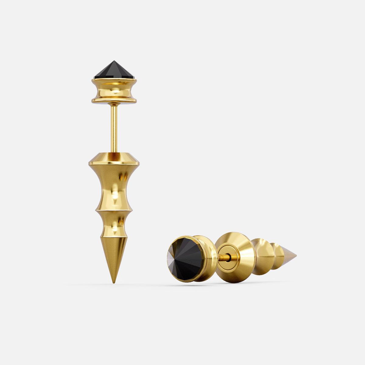 The Fang Edge Ear Studs sit tight to the lobe: compact stems ending in a tapered ridge tip. Mass sits at the point; the rest stays clean, so the read is sharp without bulk.