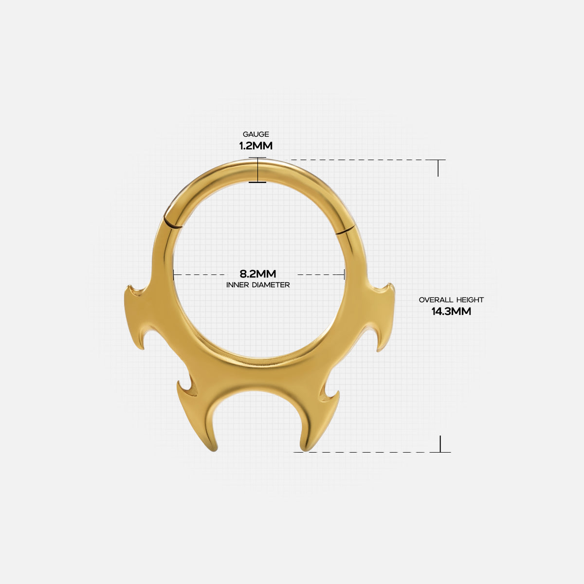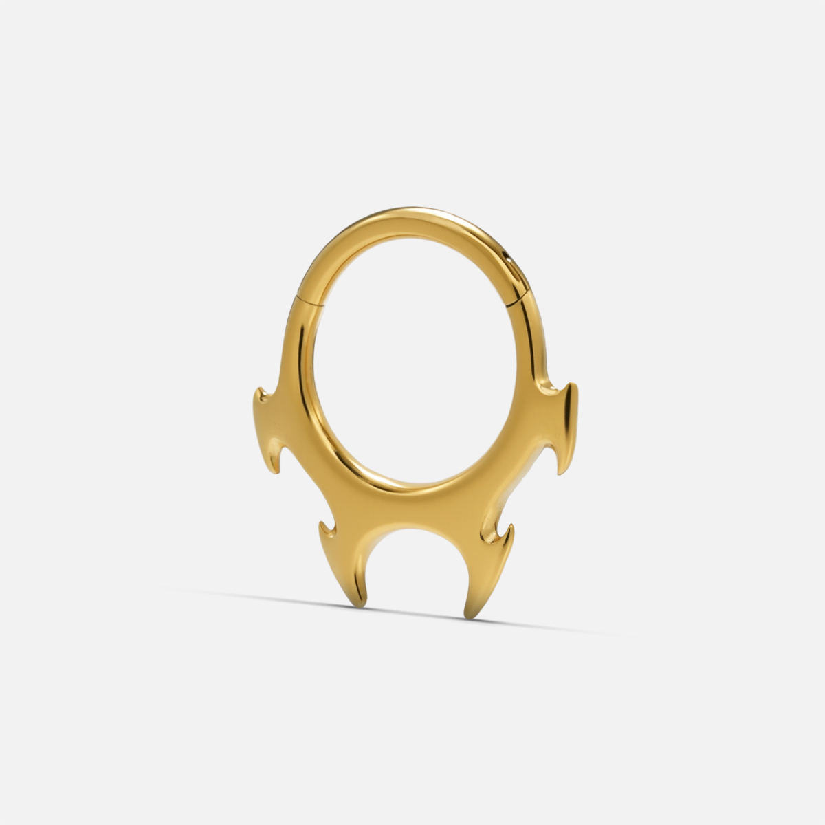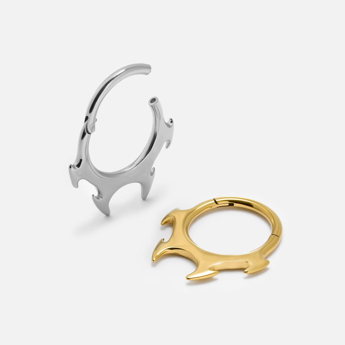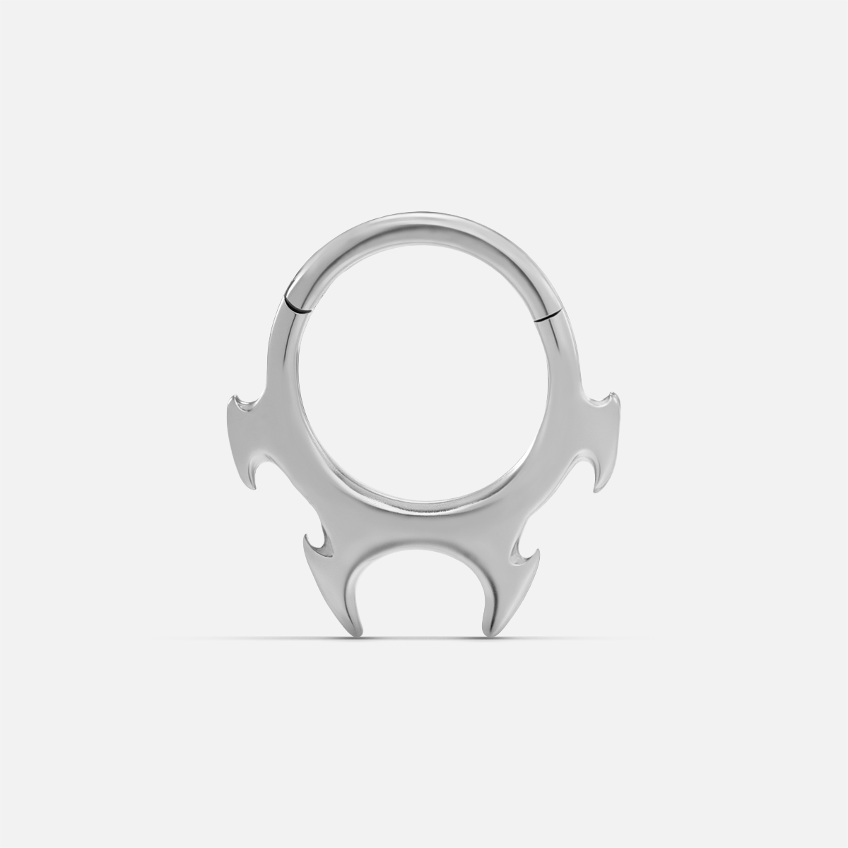 Inspired by primal weapons and tribal motifs, this septum ring echoes the raw beauty of ancient warrior culture.