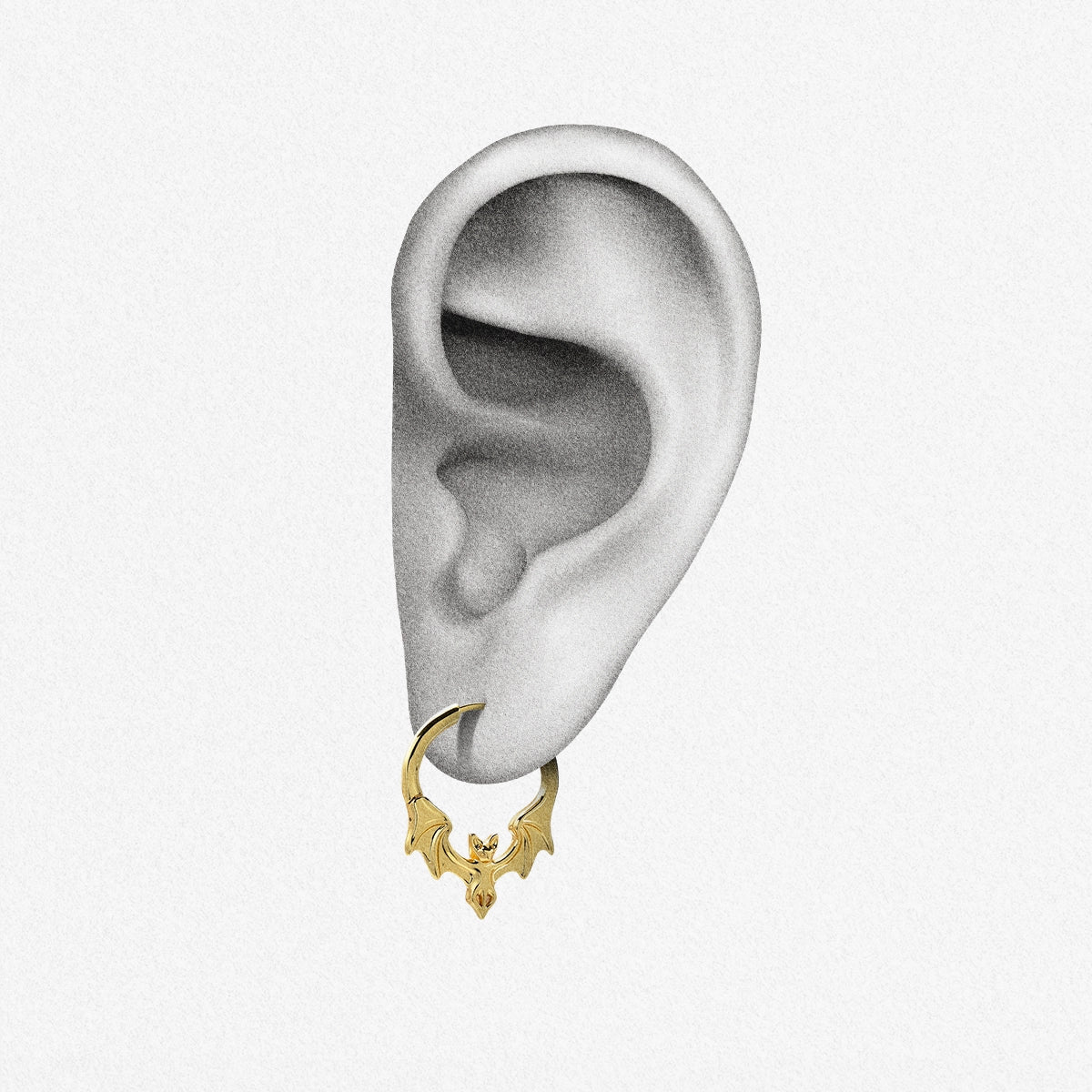 Gothic Bat Earring features a sculpted bat in mid-flight, framed by a hoop and finished in antique silver for a bold gothic look. This item is sold as a pair.