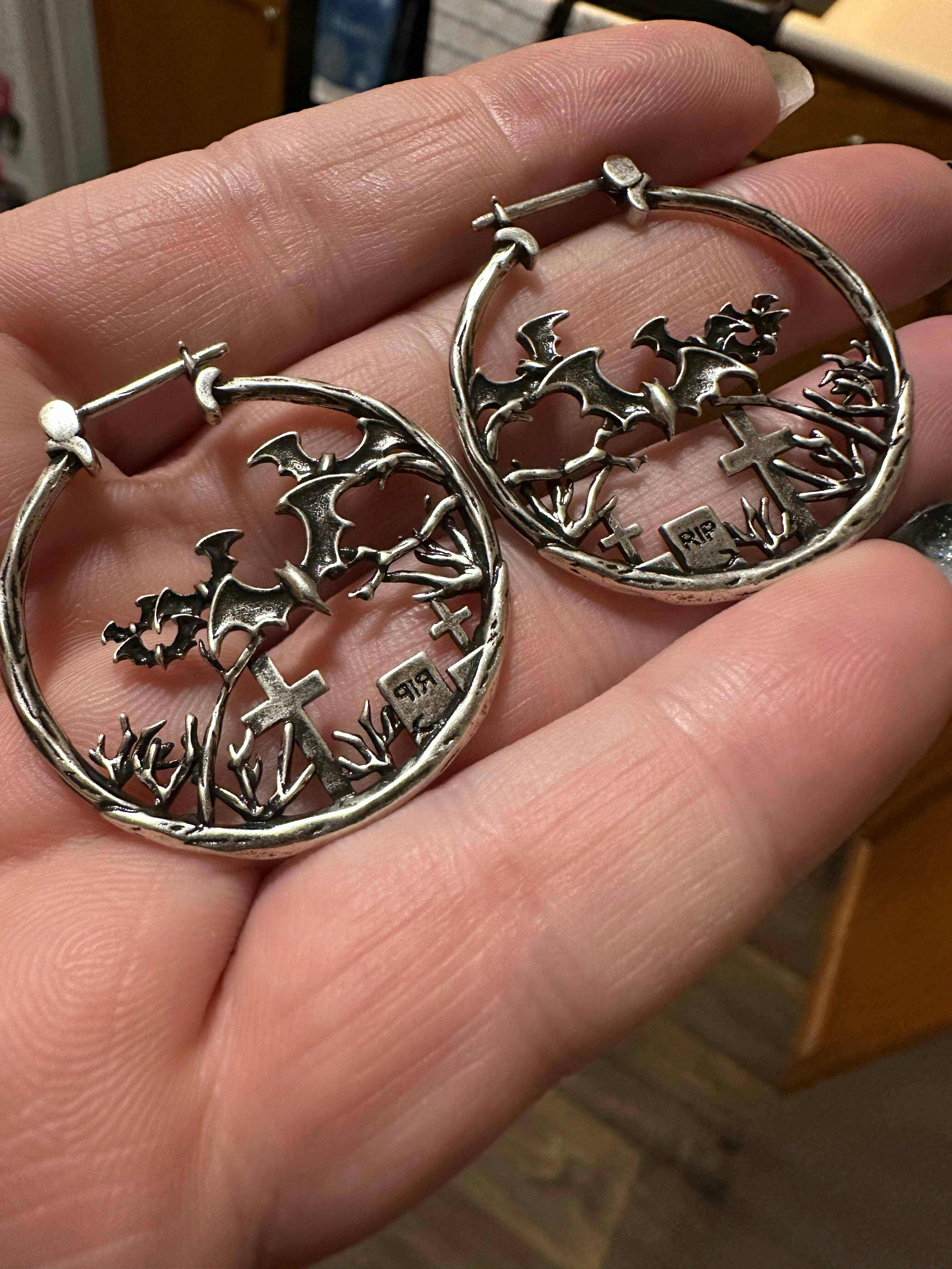 Graveyard Bat Earrings feature a circular frame with flying bats, crosses, and branches, capturing a haunting yet elegant gothic scene. This item is sold as a pair.