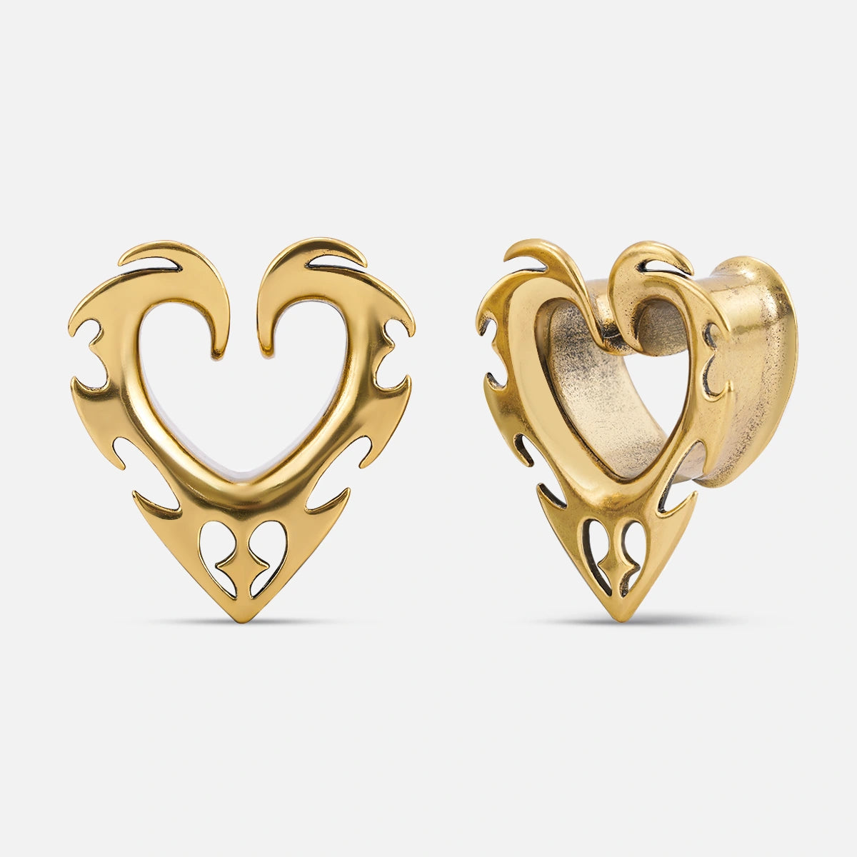 Guardian Love TUNNELS feature a heart shape with sharp edges, crafted from sleek metal, embodying a blend of elegance and strength.This item is sold as a pair.