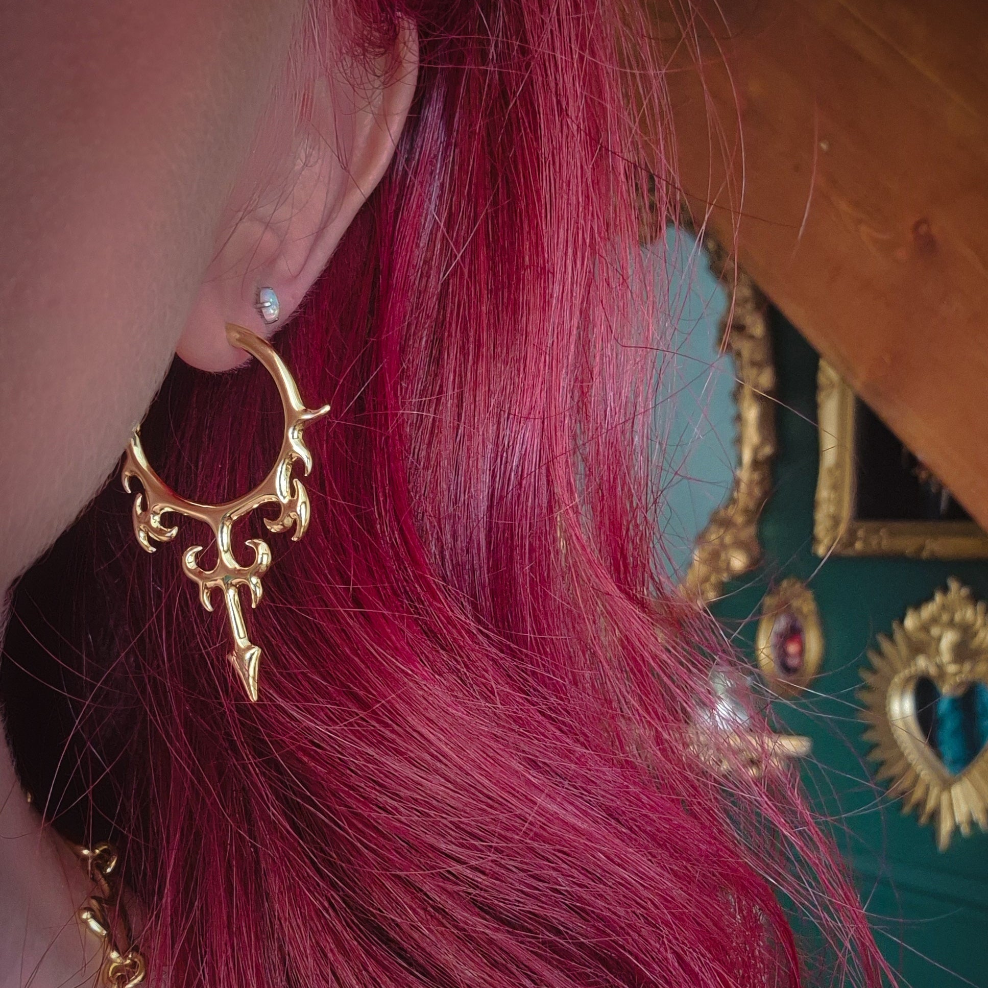 Hellflame Blade Earrings feature polished hoops with flame-like curves and a central pointed blade drop, sculpted in high-shine silver. This item is sold as a pair.