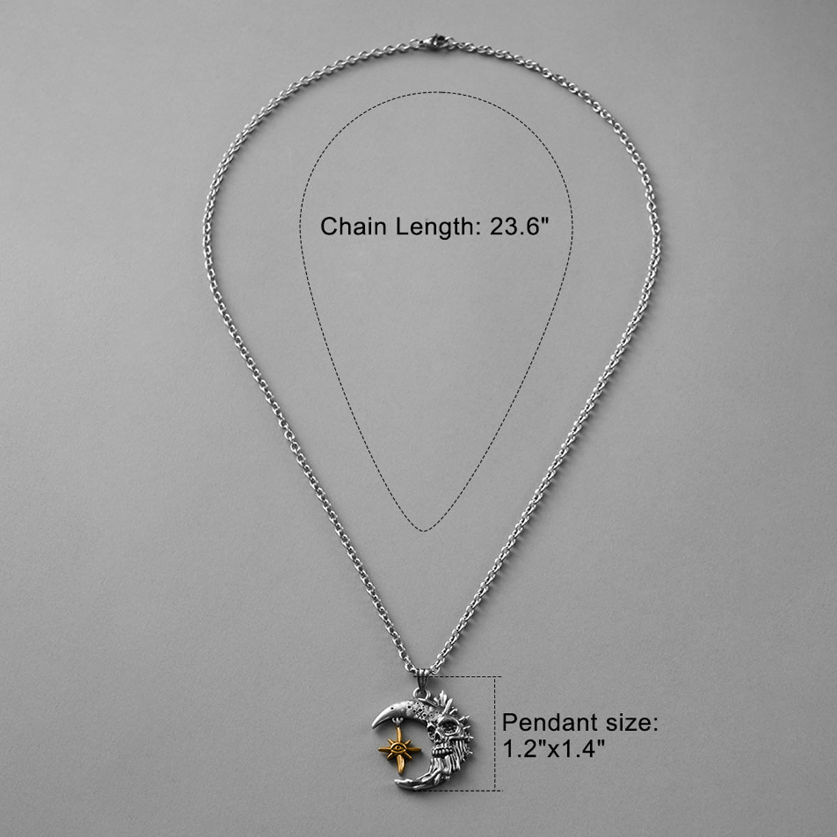 This necklace combines a silver moon with a detailed skull, symbolizing the mystery of the night. This item is sold individually.