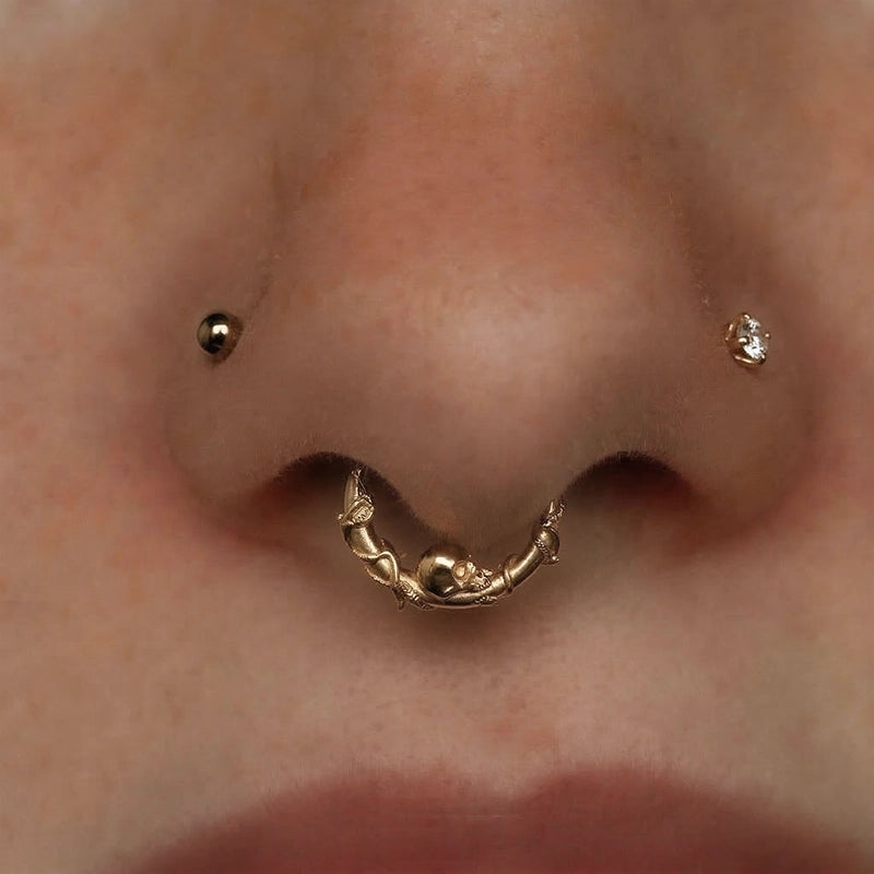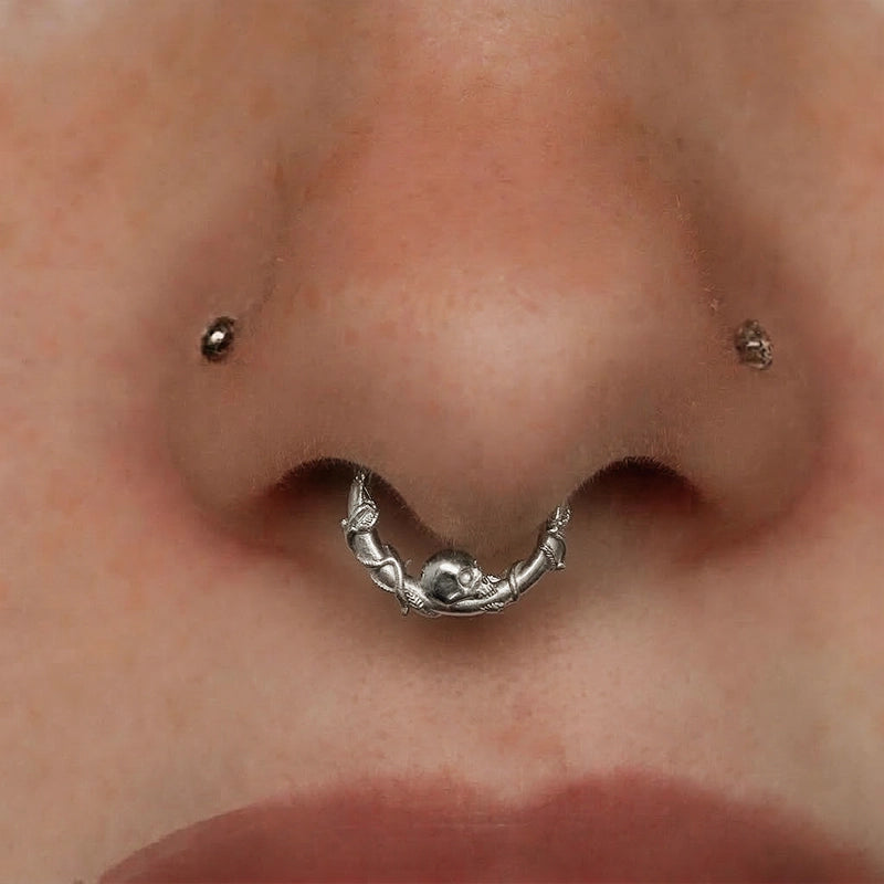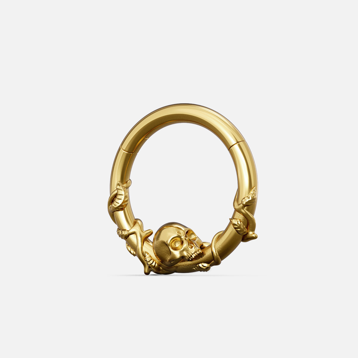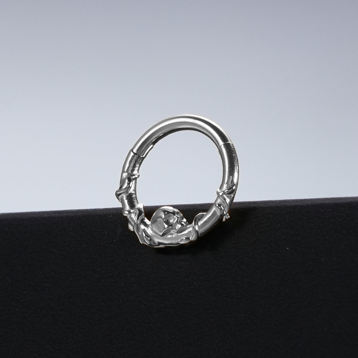 The Rebirth Vine Clicker features skeletal hands entwined around the hoop like twisting vines, cradling a small skull at the base as its haunting centerpiece.
