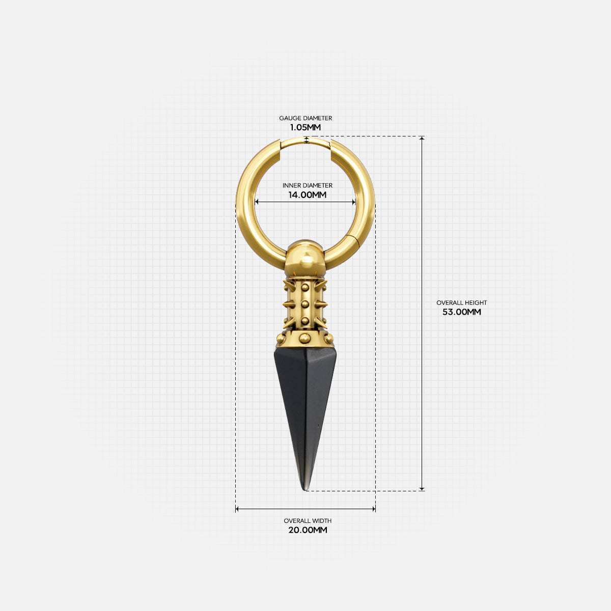 Rivet Prism Earring features a polished hoop connected to a studded cylindrical collar, finished with a faceted violet crystal spike that creates a sharp vertical silhouette.