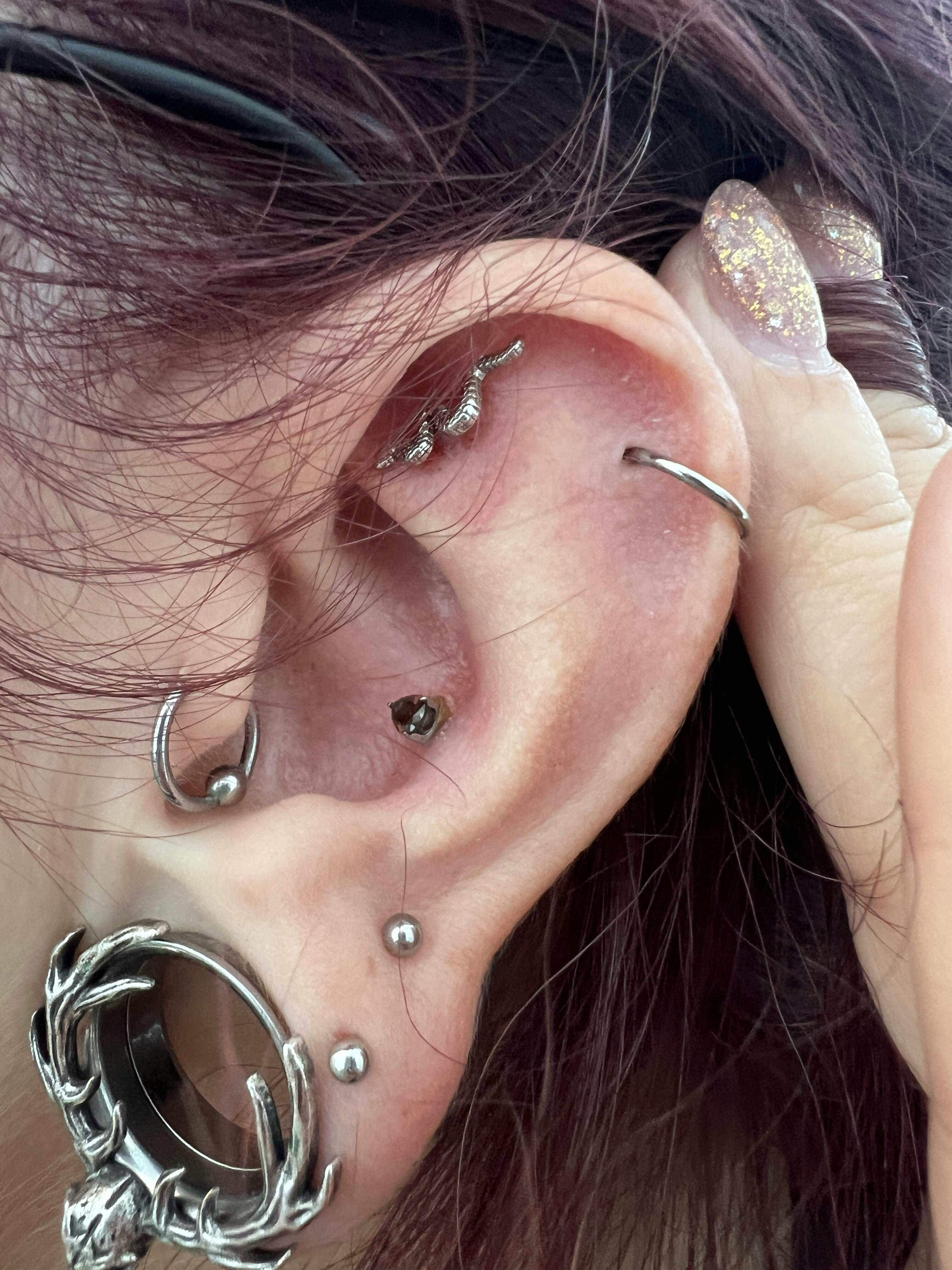 The Serpent-Inspired Flat Back Stud features a sleek, minimalist design with a captivating serpentine form, adding elegance to any piercing. This item is sold separately.