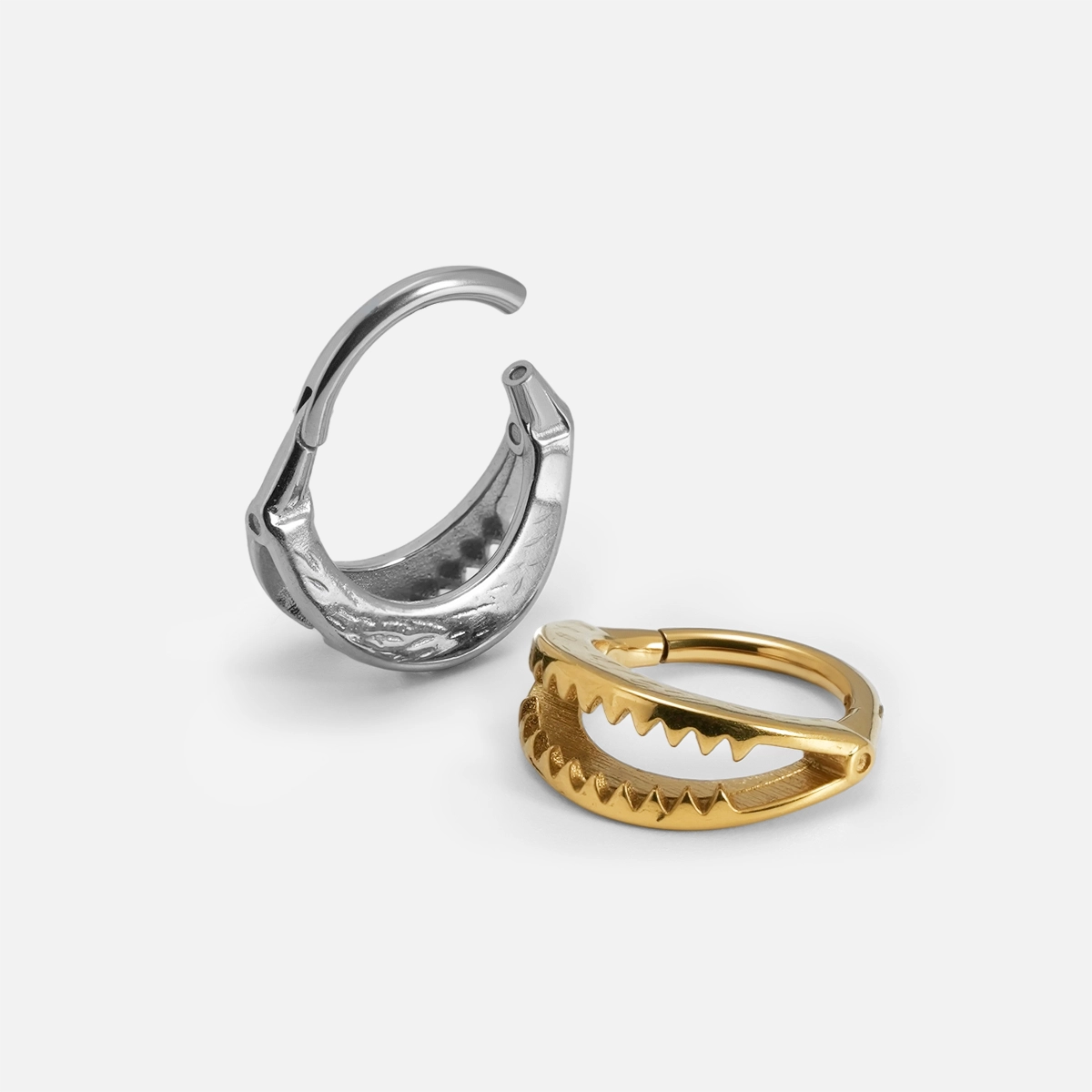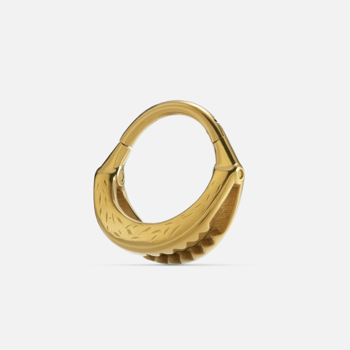 Serrated Gear Clicker pairs a clean round hoop with a rugged crescent edge cut into sharp industrial ridges. This item is sold individually.