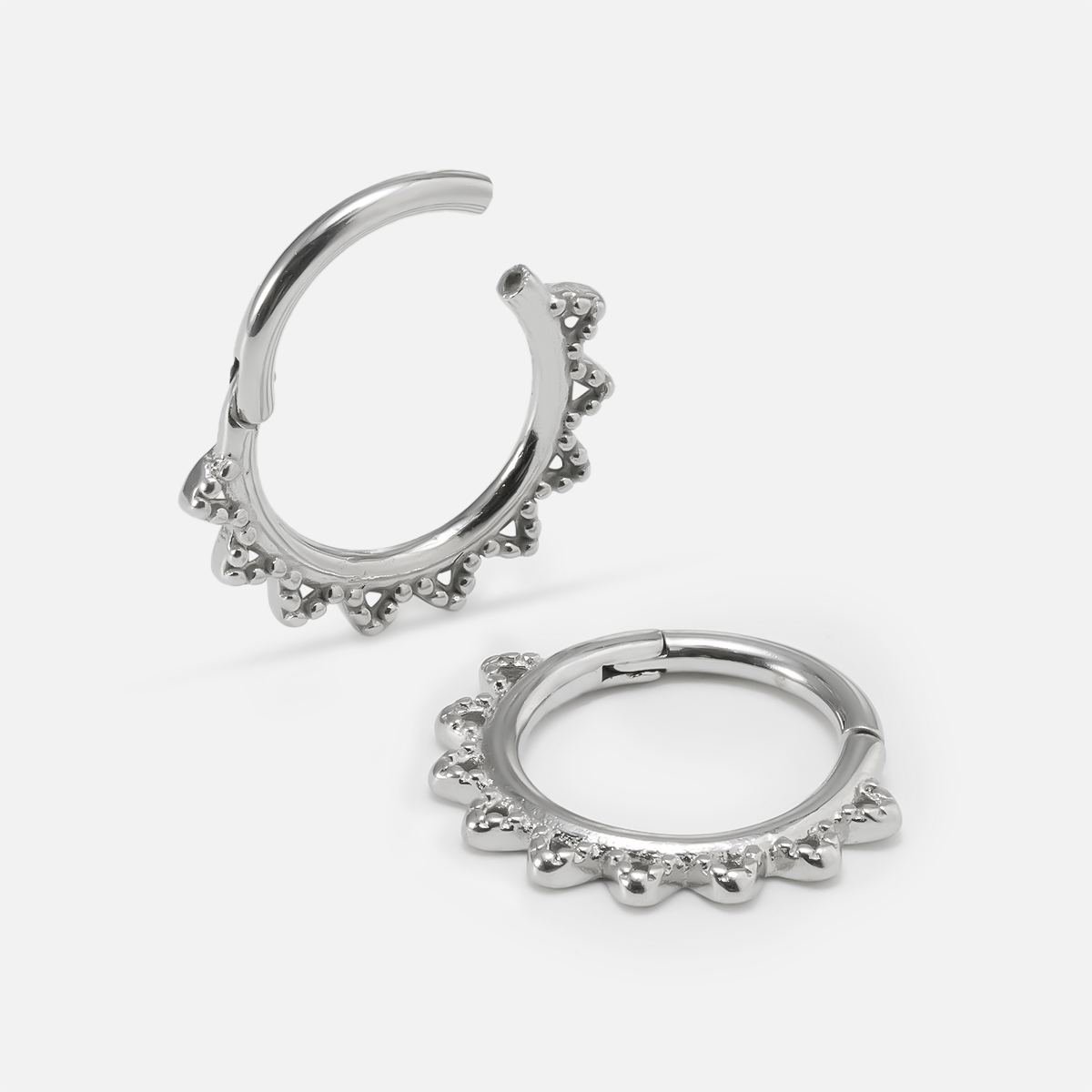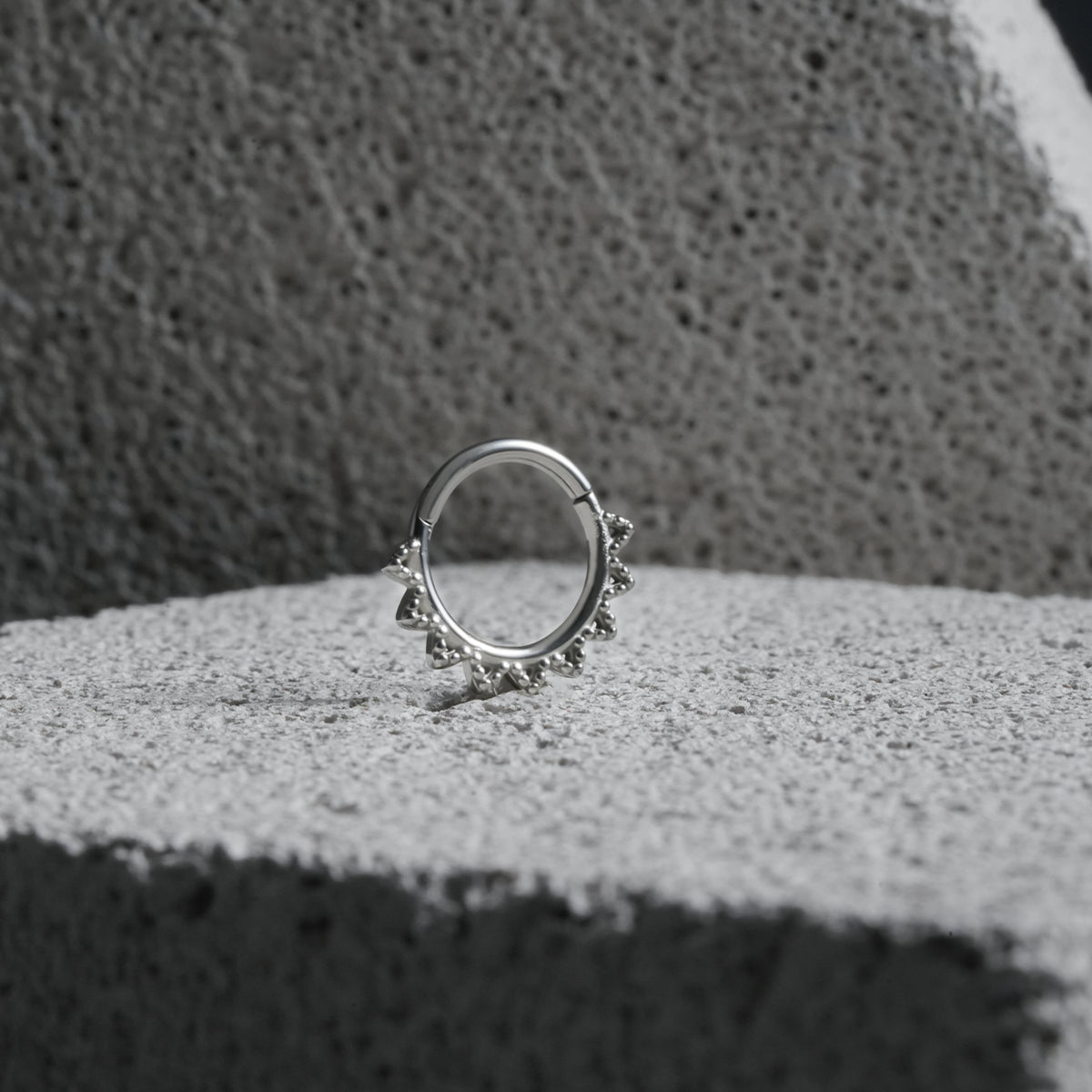 This Spike Ring Clicker features sharp spikes and sleek silver metal, delivering a modern, edgy look that merges fashion with individuality. This item is sold individually.