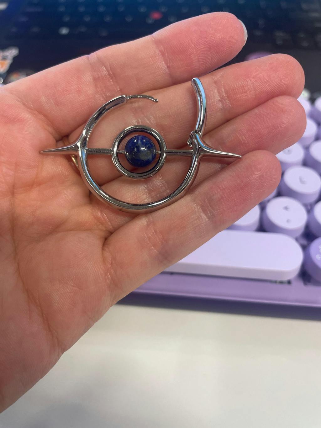 The Stellar Grace Earrings trace an elliptical arc, tapered at both ends, anchored by a central gemstone orb. Their form draws from ancient amulets and cosmic iconography, fusing planetary geometry with symbolic force. This is jewelry that moves between dimensions—part talisman, part avant-garde sculpture.