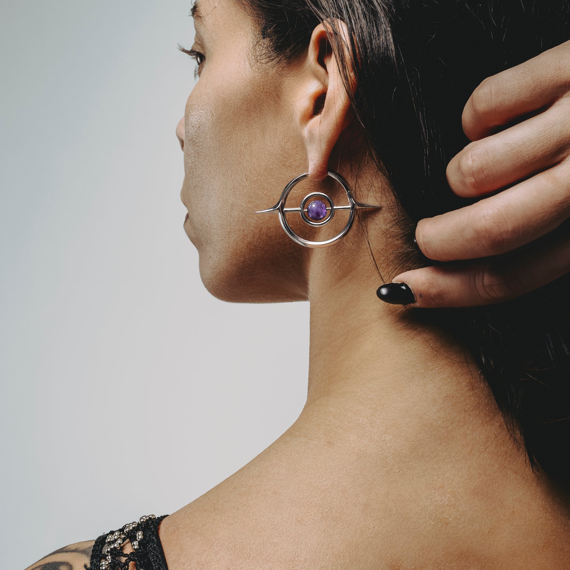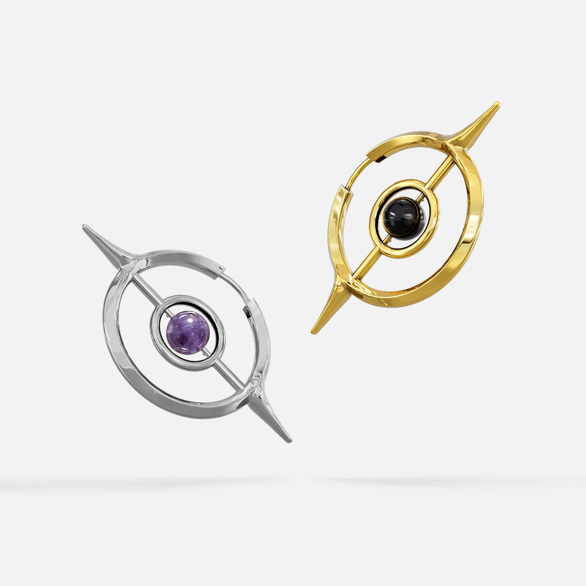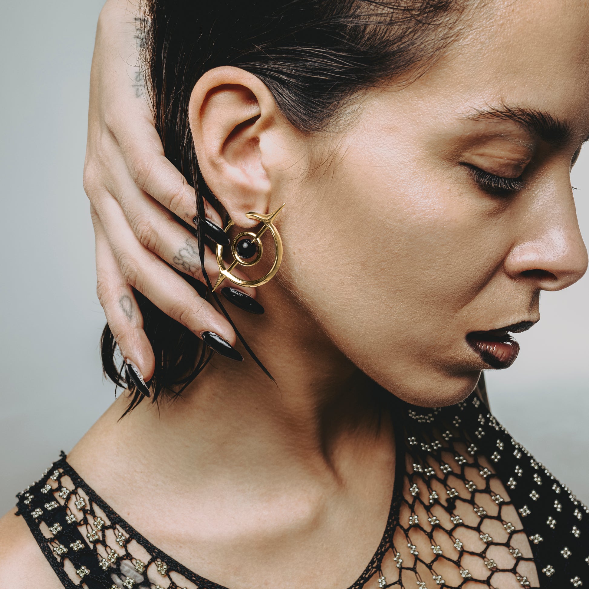 The Stellar Grace Earrings trace an elliptical arc, tapered at both ends, anchored by a central gemstone orb. Their form draws from ancient amulets and cosmic iconography, fusing planetary geometry with symbolic force. This is jewelry that moves between dimensions—part talisman, part avant-garde sculpture.