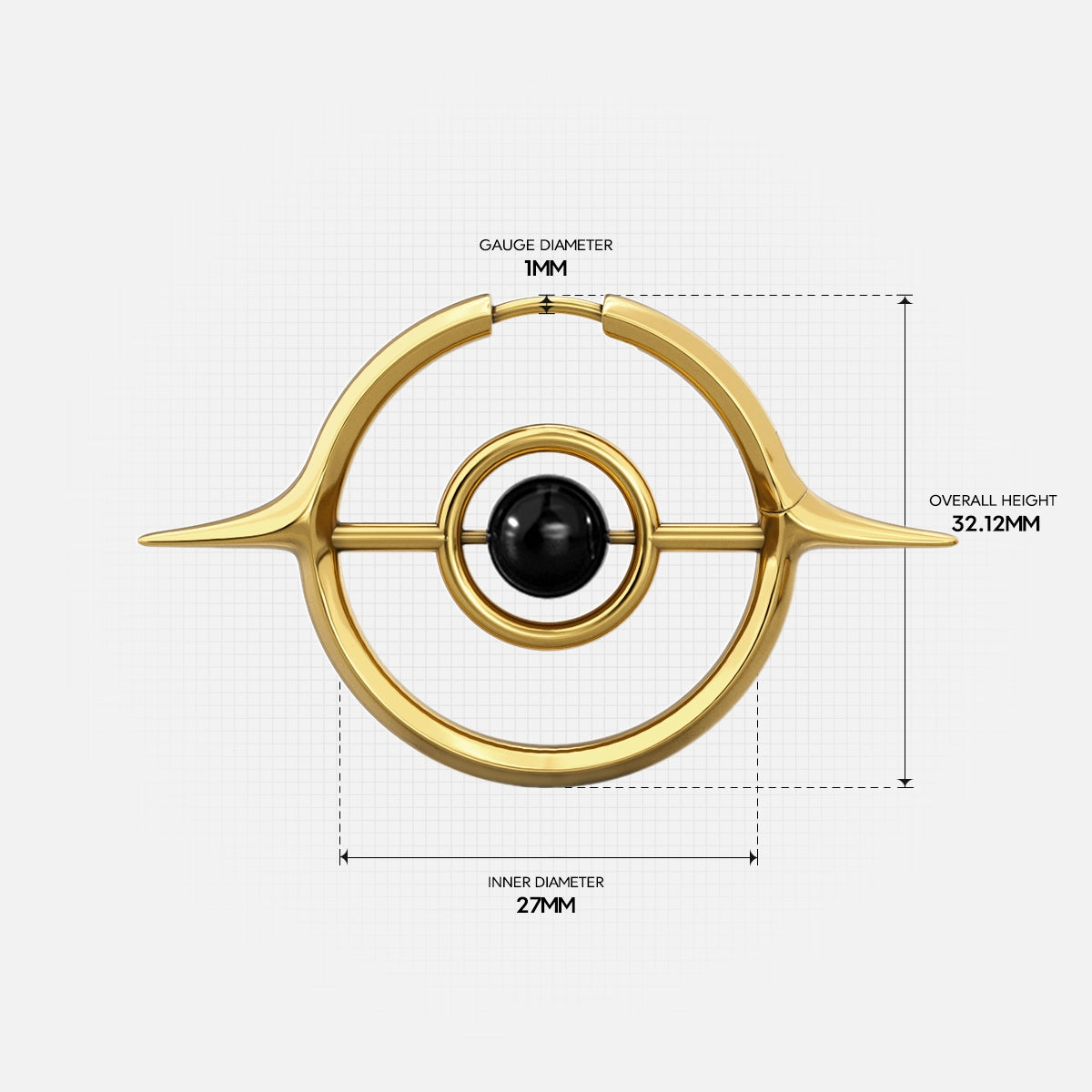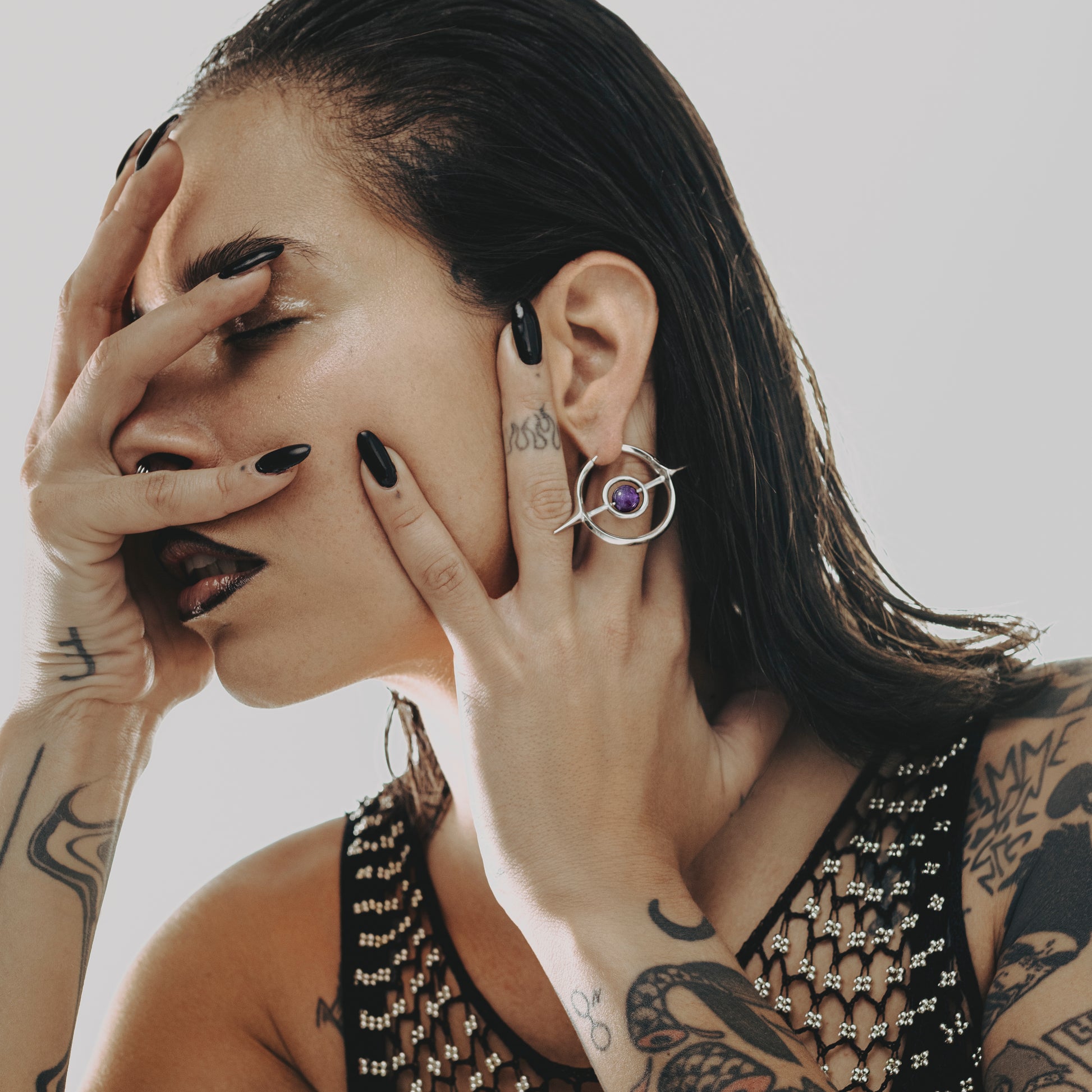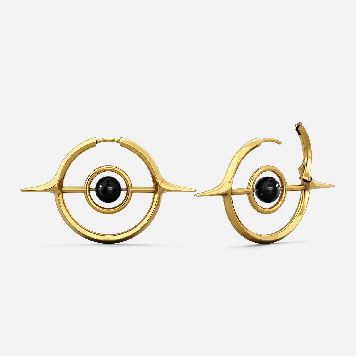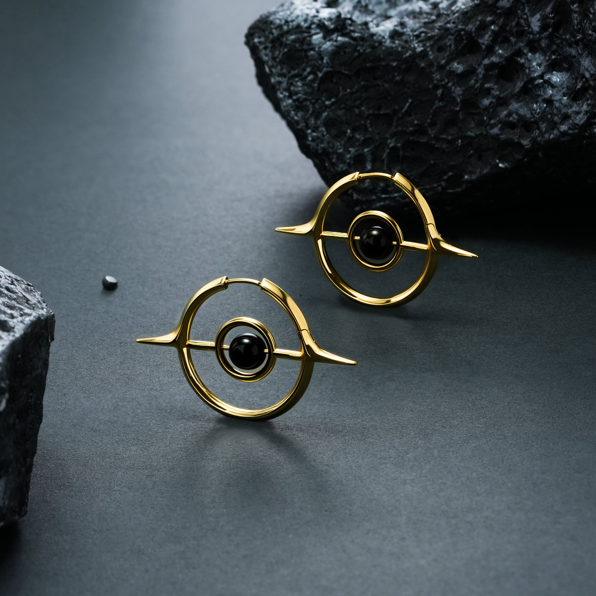 The Stellar Grace Earrings trace an elliptical arc, tapered at both ends, anchored by a central gemstone orb. Their form draws from ancient amulets and cosmic iconography, fusing planetary geometry with symbolic force. This is jewelry that moves between dimensions—part talisman, part avant-garde sculpture.