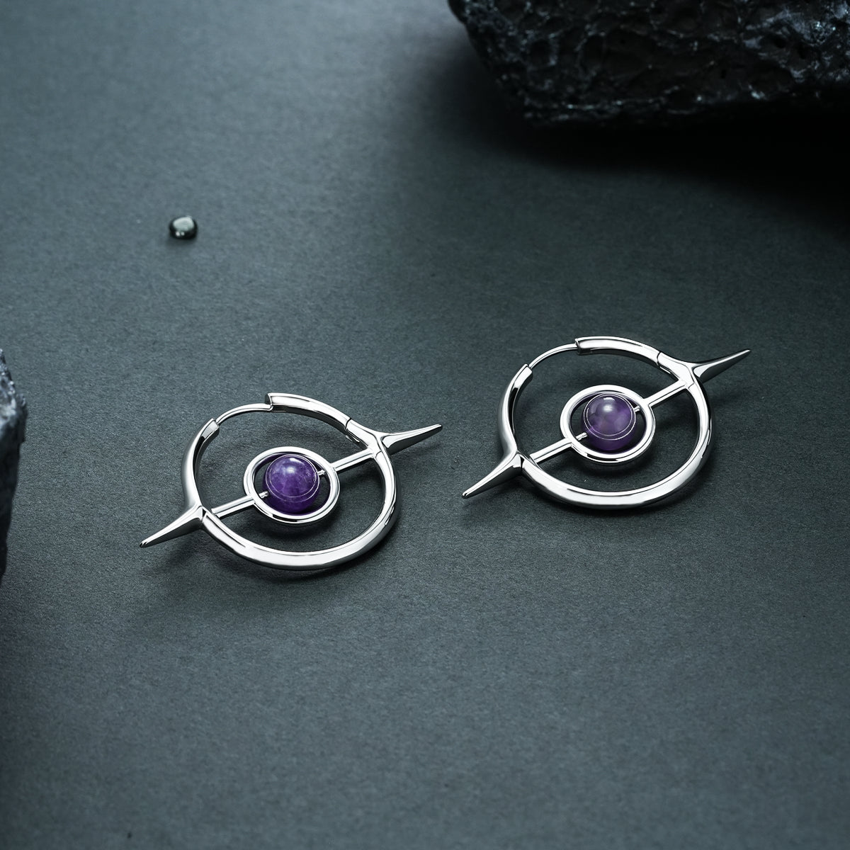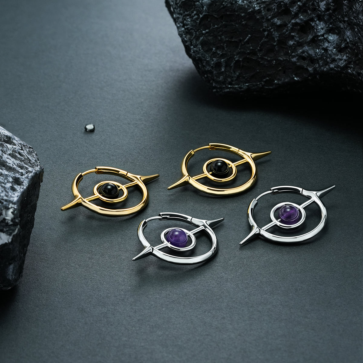 Cast in brass, finished in shiny rhodium or bright gold, and set with natural amethyst or black obsidian.