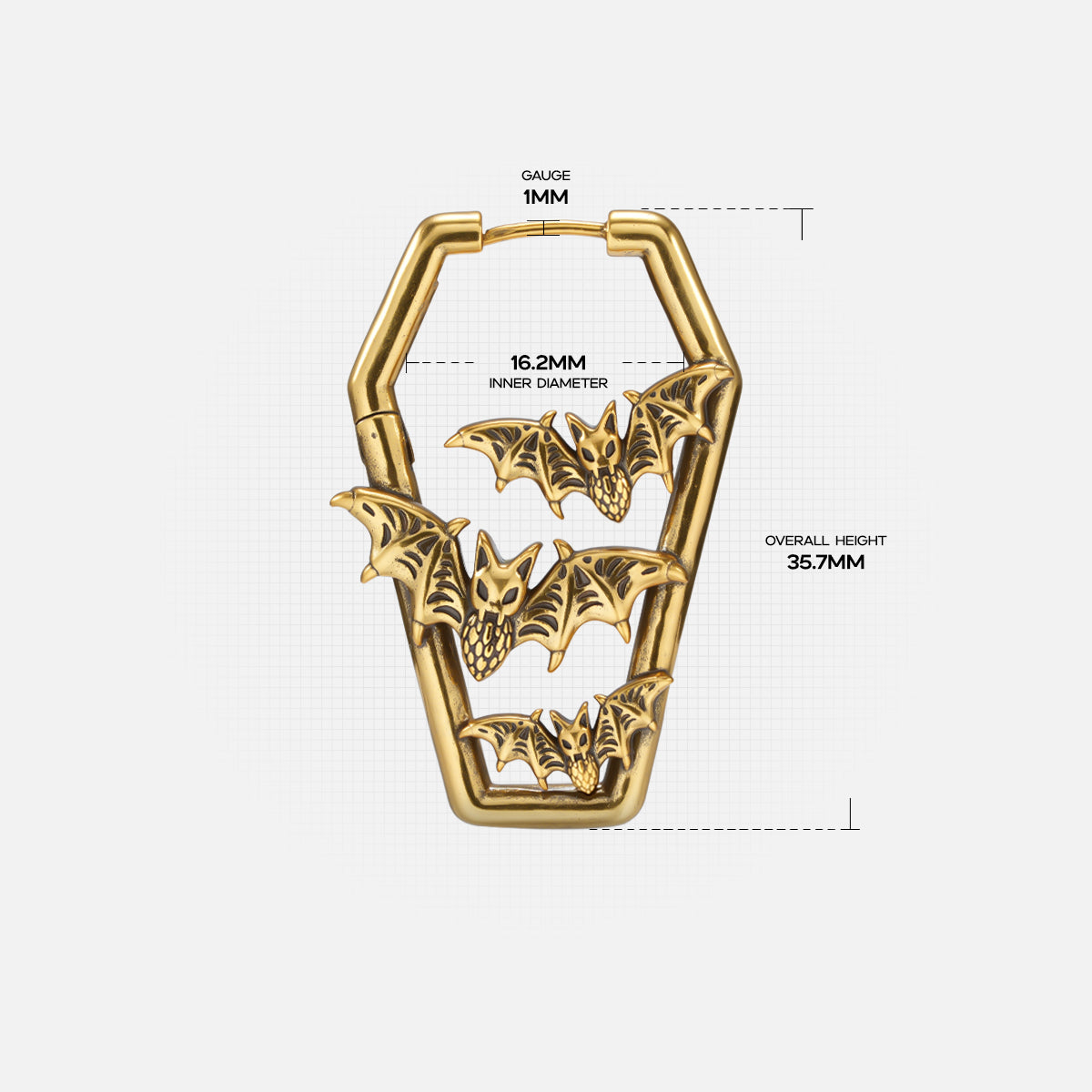 These Bat Tomb Earrings feature a unique coffin shape adorned with intricate bat designs, embodying a captivating Gothic allure. This item is sold as a pair.