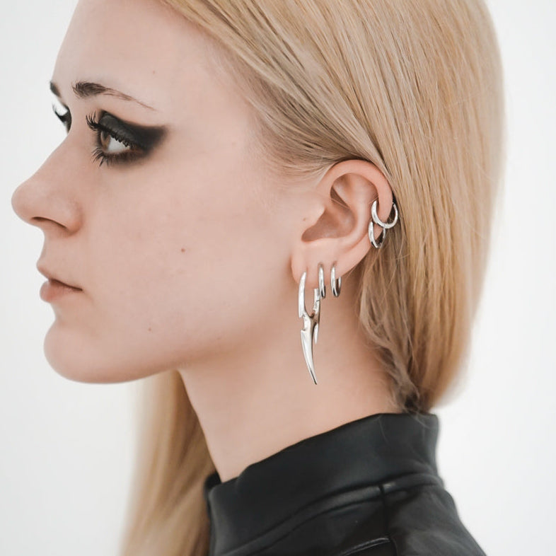 Blade Arc Earrings feature a bold, blade-like silhouette with flowing curves and a mirror-polished silver finish—perfect for lobe or cartilage piercings. This item is sold as a pair.