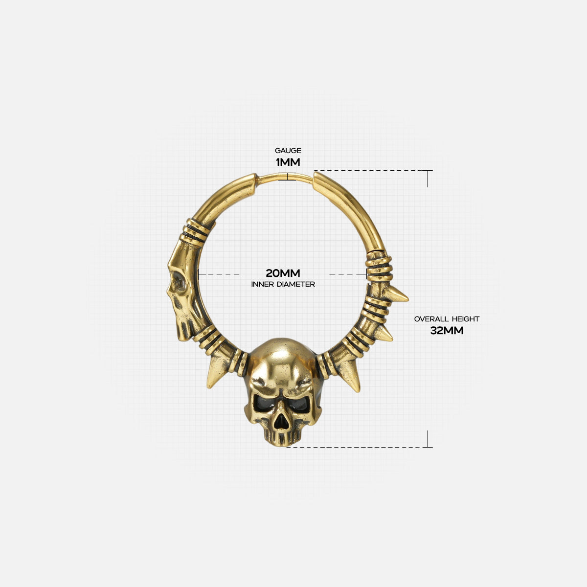 These skull hoop earrings feature bone textures, spikes, and a fierce sculpted cranium at the center. This item is sold as a pair.