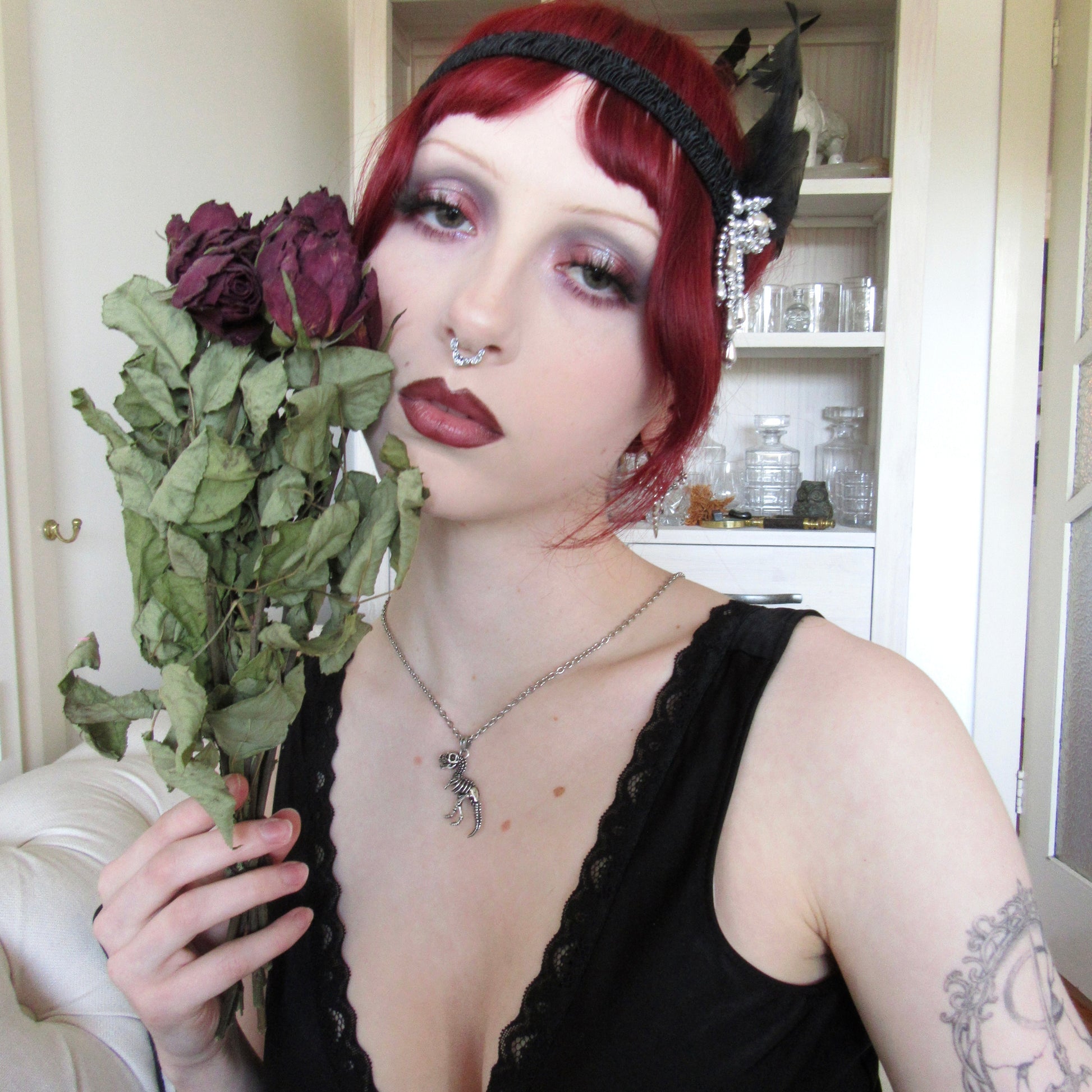 This necklace features a detailed T-Rex skeleton, symbolizing immense strength and resilience. This item is sold individually.