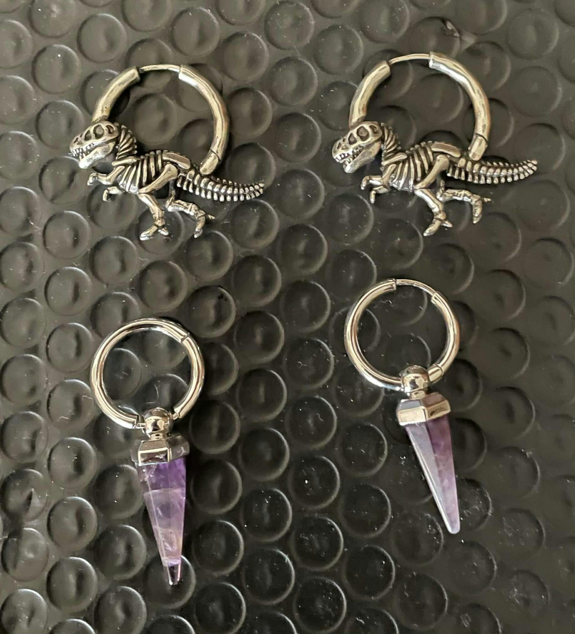 This earring features a unique amethyst shape, combining geometric design with natural elements, showcasing a perfect balance of elegance and individuality. This item is sold as a pair.