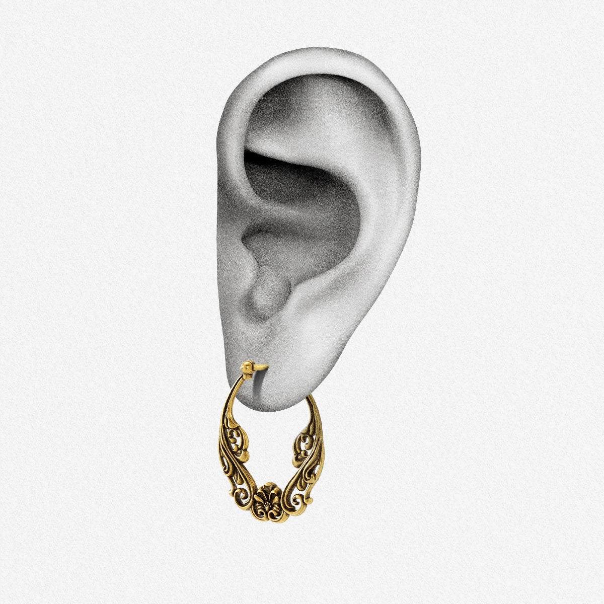 This hoop design features symmetrical scrollwork rising toward a sculpted floral centerpiece, creating a form that feels balanced, refined, and architectural.