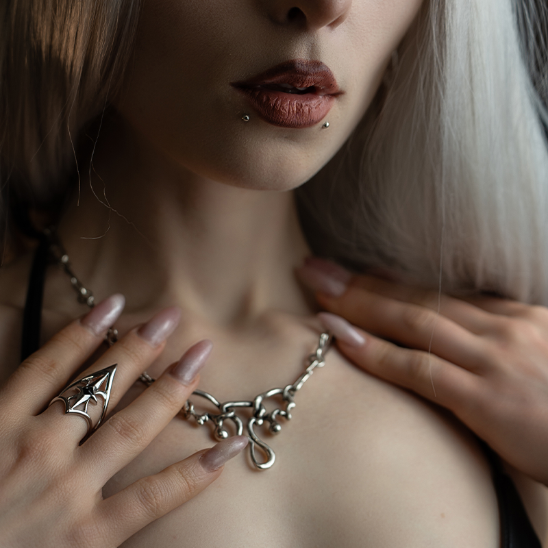Meet the Midnight Vow Trio — a 3-piece set built to cut through convention. A mirror-polished blade silhouette, a piercing-inspired fluid line, and a shield ring that reads like armor: this bundle is clean, sharp, and unapologetically misfit. The Blade Arc Earrings bring a bold, blade-like curve designed for lobe or cartilage styling; the Fluid Pin Necklace flows with modern piercing energy, balancing softness and edge; and the Crest Shield Ring frames the finger in pointed openwork geometry, converging into a square-cut black stone for a precise, protective finish. Wear it with monochrome, techwear, or leather, or with a clean fit that lets the metal speak—this set is powerful and controlled.