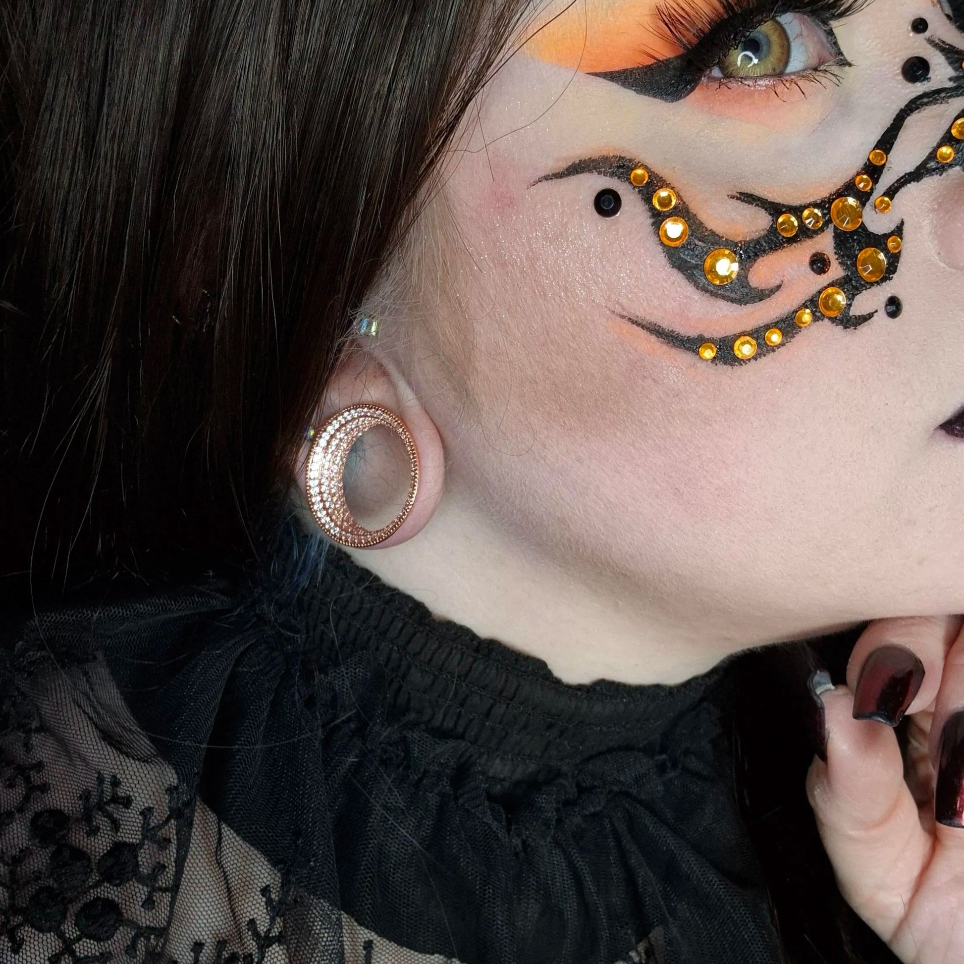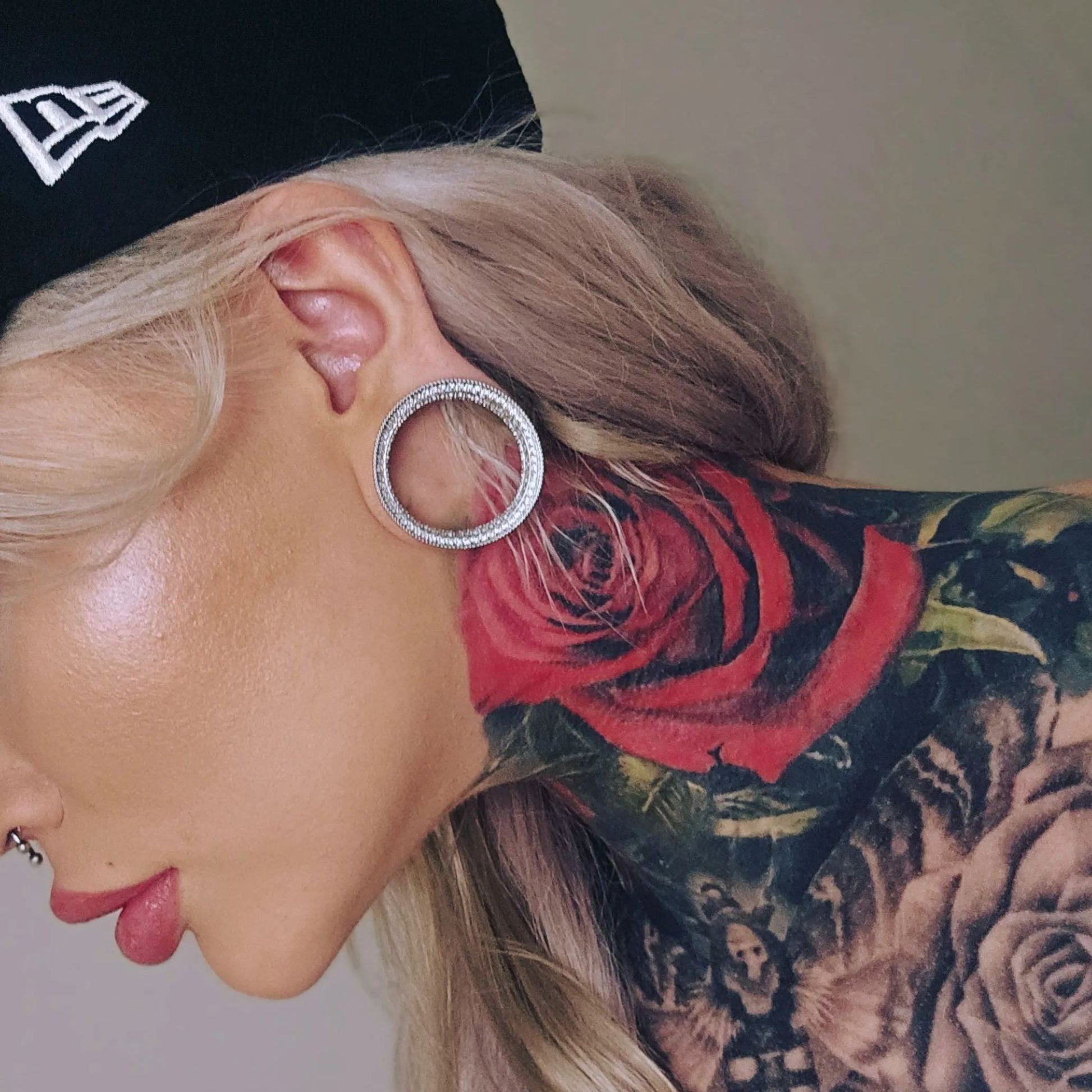 Radiant Baroque Tunnels feature a sleek, circular design adorned with multiple rows of sparkling crystals. The outer and inner rims are meticulously crafted to create depth and dimension, giving the piece an elegant and luxurious appearance. This item is sold as a pair.