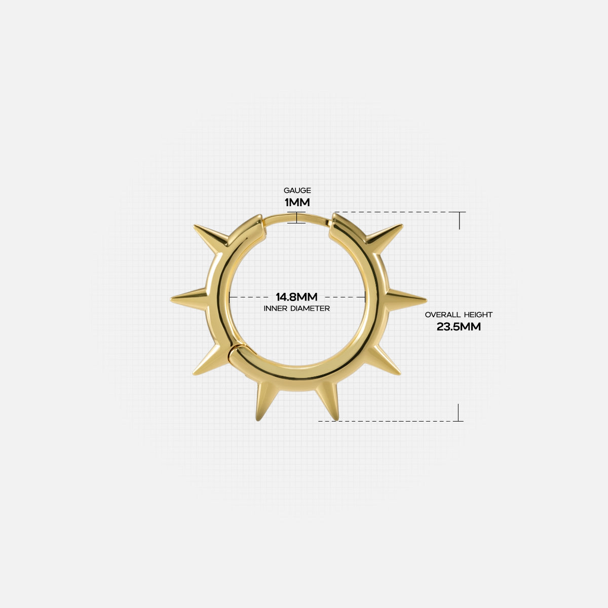 Bold and edgy, these Rebel Spike Hoop Earrings feature a circular design with striking spikes, offering a modern, statement-making look. This item is sold as a pair.