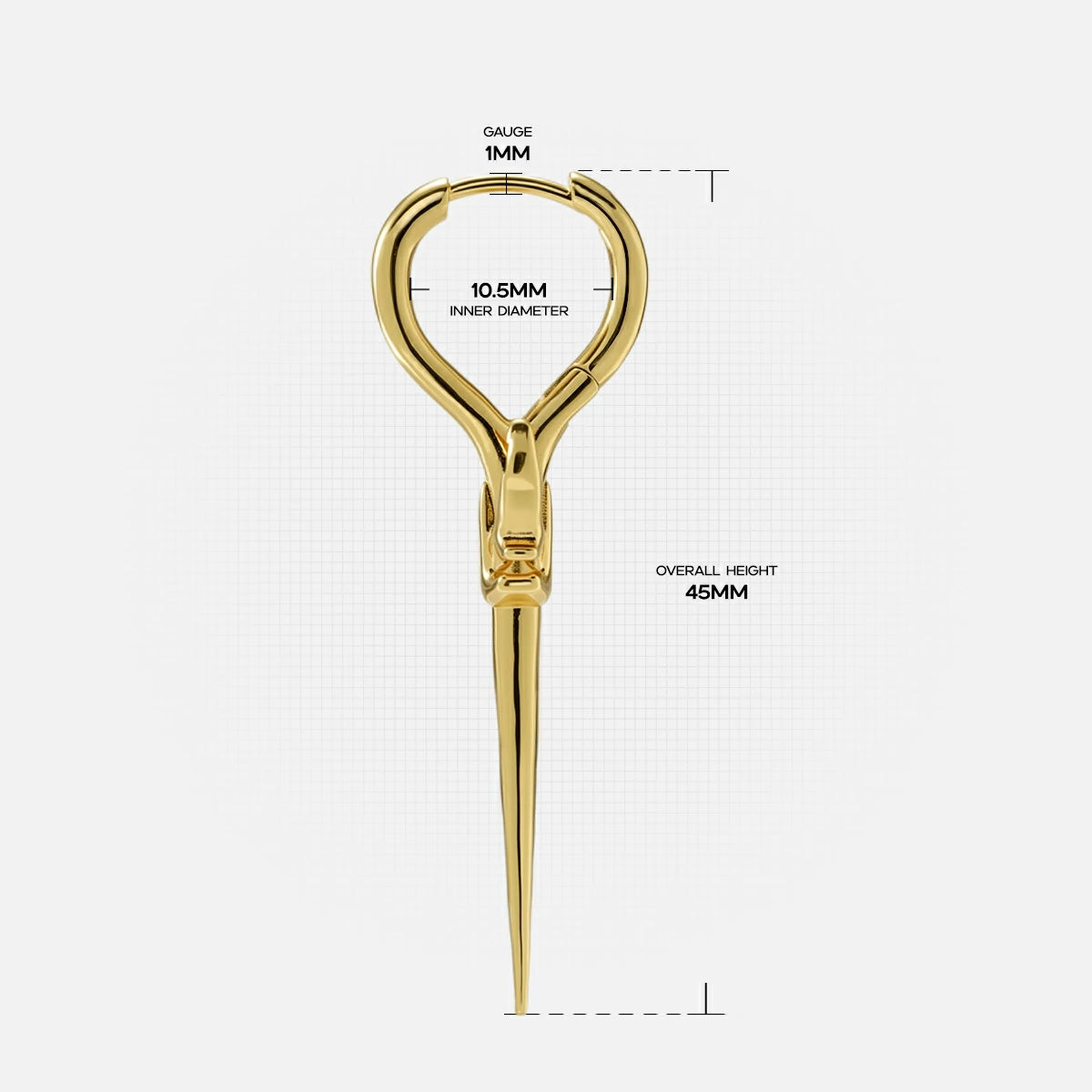 This design combines a smooth, sculpted hoop with a long, tapered spike held in place by claw-like details, creating a balance between fluid form and controlled sharpness.